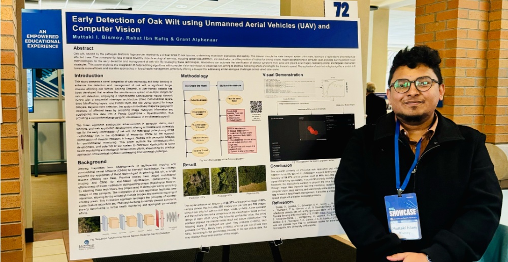 GVSU's Dr. Rahat Ibn Rafiq aDr. Rahat Ibn Rafiq and his research team, including graduate assistant Muttaki Bismoy leads a project using drones and AI to protect Michigan forests from invasive diseases, partnering with the DNR, Grand Haven, and Kalamazoo.