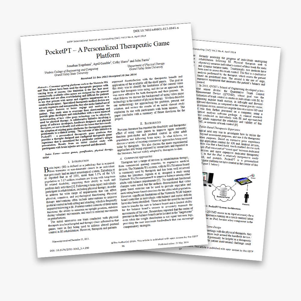 • Engelsma, J., Gamble, A., Harro, C., & Farris, J. (2014). PocketPT–A Personalized Therapeutic Game Platform. Journal on Computing (JoC), 3(4).