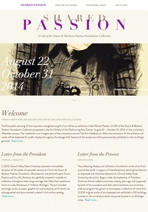 The first public showing of this important and generous gift of art will be an exhibition titled Shared Passion: A Gift of the Stuart & Barbara Padnos Foundation Collection presented in the Art Gallery of the Performing Arts Center, August 22 – October 31, 2014 on the university’s Allendale campus.