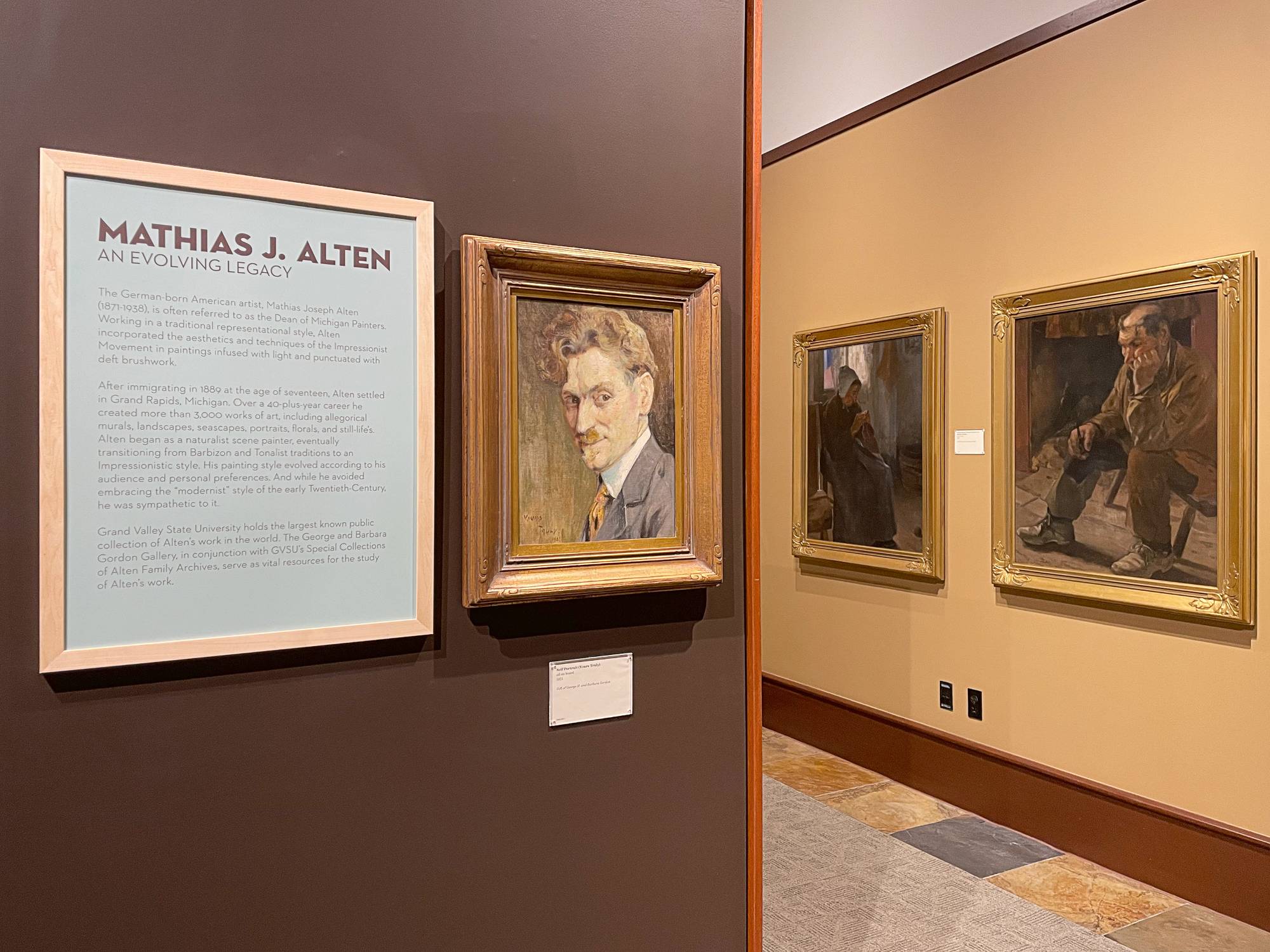 George and Barbara Gordon began collecting work by Mathias J. Alten more than 50 years ago. An outdoor enthusiast who traveled throughout Michigan, George was particularly fond of Alten's landscapes. As the Gordon's collection grew, they sought an opportunity to share their love of Alten's work with others. A partnership with GVSU was formed, and the George and Barbara Gordon Gallery was constructed as part of the Richard M. DeVos Center in Fall 2000. Soon after, as the collection increased, additions to the space were made. This resulted in the now roughly 2,500 square foot gallery space, spanning two floors, that features the university's collection of Alten's work.