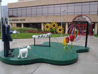 Grand Valley State University's Robert C. Pew Grand Rapids Campus is situated along the Grand River between Pearl and Fulton Street, and located at the west end of the historic Blue Bridge. The Blue Bridge is a heavy populated pedestrian bridge that connects the west side of Grand Rapids, to Grand Rapids City Center. The metropolitan downtown campus is accessed by numerous students, visitors, faculty and staff and many conferences and events are scheduled during the ArtPrize Exhibition. The beautiful grounds of L.V. Eberhard Center, Fred M Keller Engineering Lab and John C. Kennedy Hall of Engineering make this an ideal place to showcase exterior works of art by local, national an international artists.