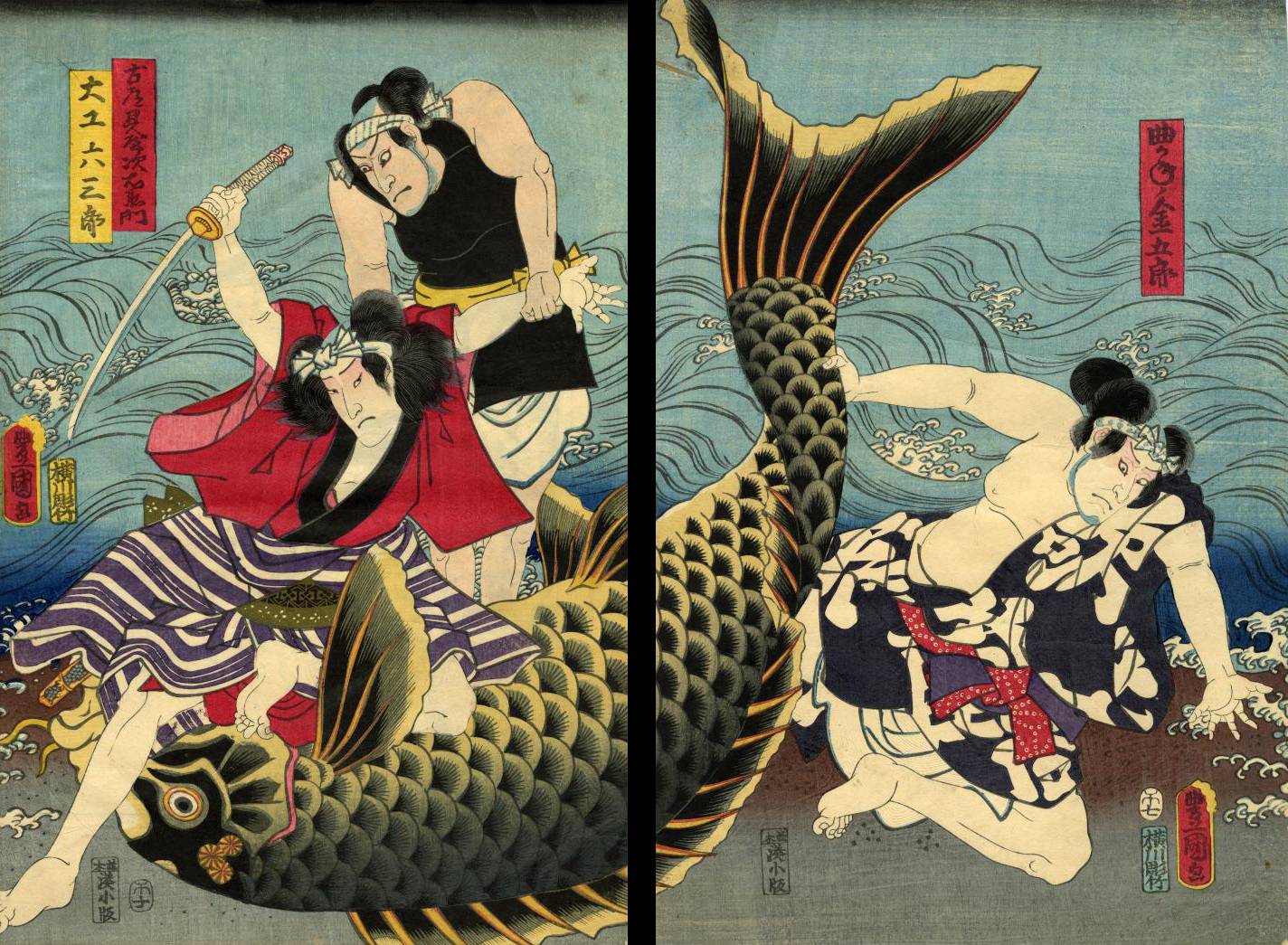 Utagawa Kunisada, The Carpenter Rokusaburo Catching the Carp, ca. 1850, L11.2022.22ab, Promised Gift of Charles Schoenknecht and Ward Paul, Utagawa Hiroshige, Mimasaka Province, Yamabushi Valley: Sixty-odd Famous Views of the Provinces (no.46), 1853, L11.2022.547, Promised Gift of Charles Schoenknecht and Ward Paul, Utagawa Hiroshige, Fifty-Three Stations of the Tokaido: Shinagawa (no.2), ca. 1833-34, 2011.96.2, Utagawa Kuninaga, Minamoto no Yorimitsu (Raiko) and His Retainers Defeat the Earth Spider (left sheet of triptych), 1829, 2021.33.1933, Gift of Charles Schoenknecht and Ward Paul.