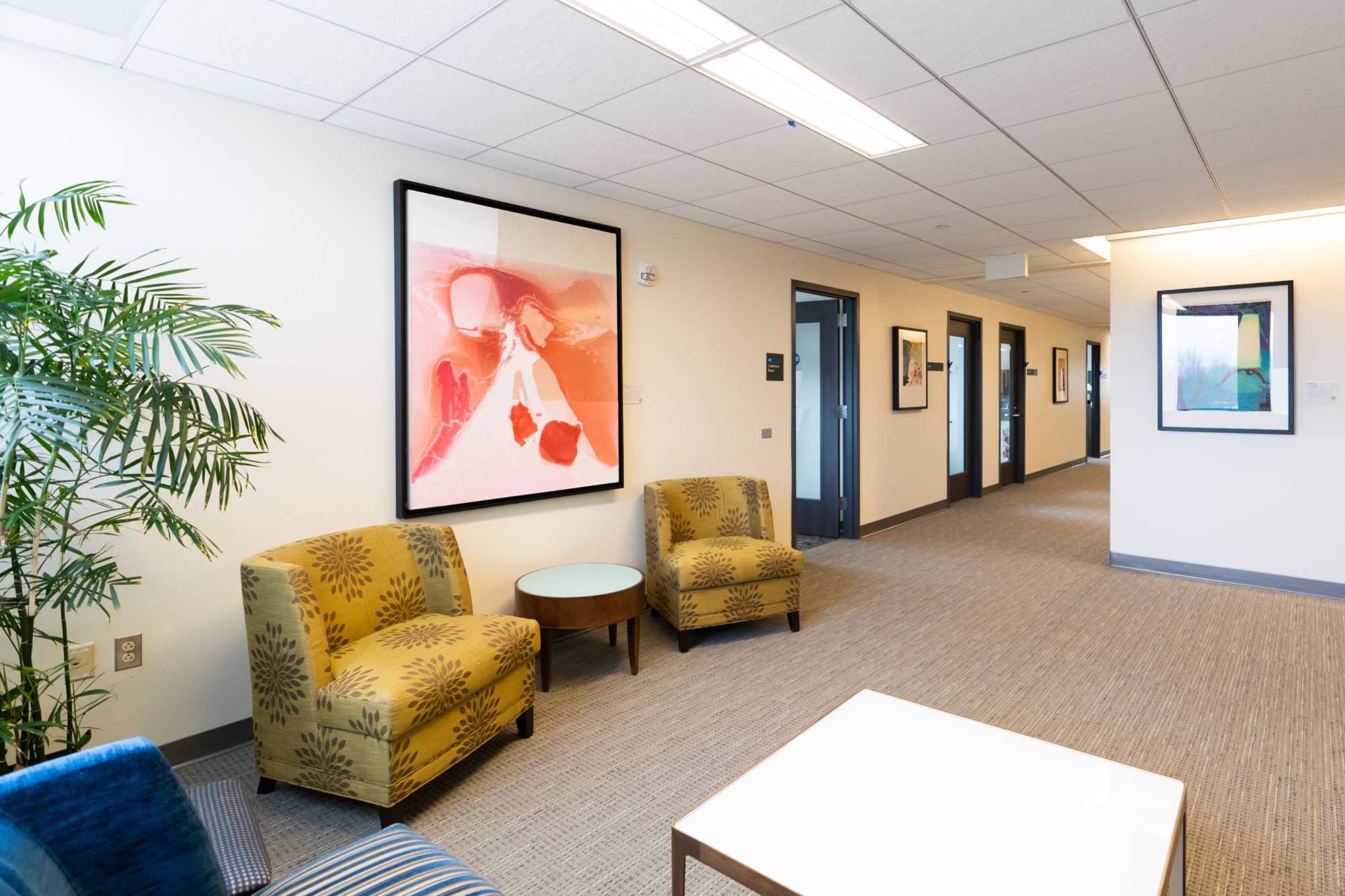 Hallway in the Office of the Provost featuring the painting Be Vast- You Do Not Bring An Ocean To A River by Sheryl Budnik, 2020.17.1.