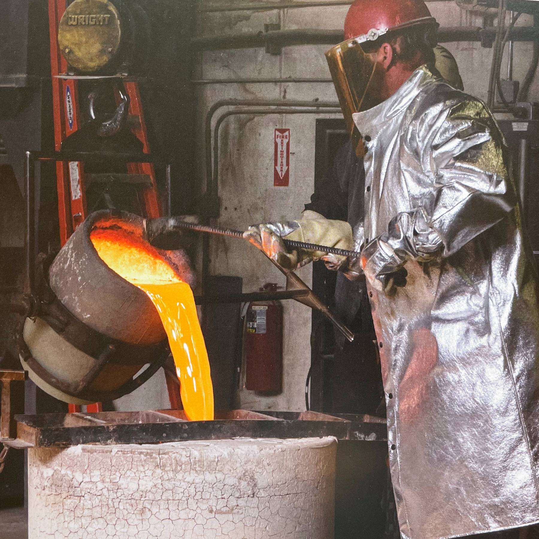 Pouring molten bronze into a cast to make one of Deborah Butterfield's sculptures.