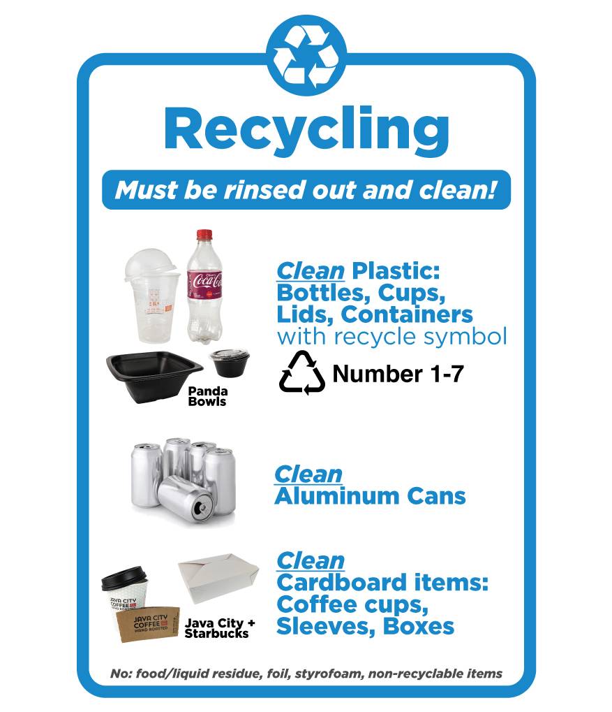 Single-stream recycling is available campus-wide. Look for a designated recycling bin at dining locations. All items must be rinsed out, clean, and dry.