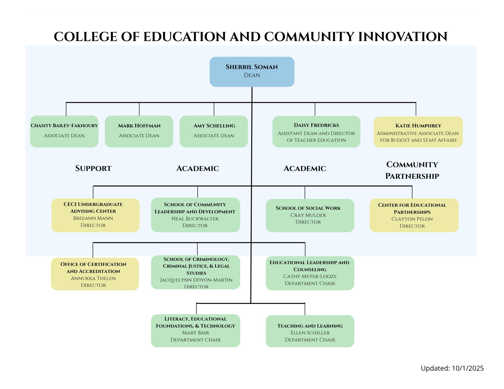 The College of Education and Community Innovation (CECI) was established in 2021 with the merger of the College of Education and College of Community and Public Service. CECI's preexisting schools, departments and centers all had strong community connections and a professional focus.