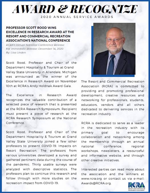Scott Rood, Assistant Professor and Chair of the Hospitality and Tourism Management Department, received the Excellence in Research Award during the Resort and Commercial Recreation's (RCRA) National Conference.