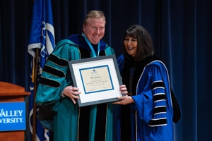 Dr. Brian Johnson, professor of criminal justice, receives the Outstanding University Service Award from President Philomena V. Mantella.