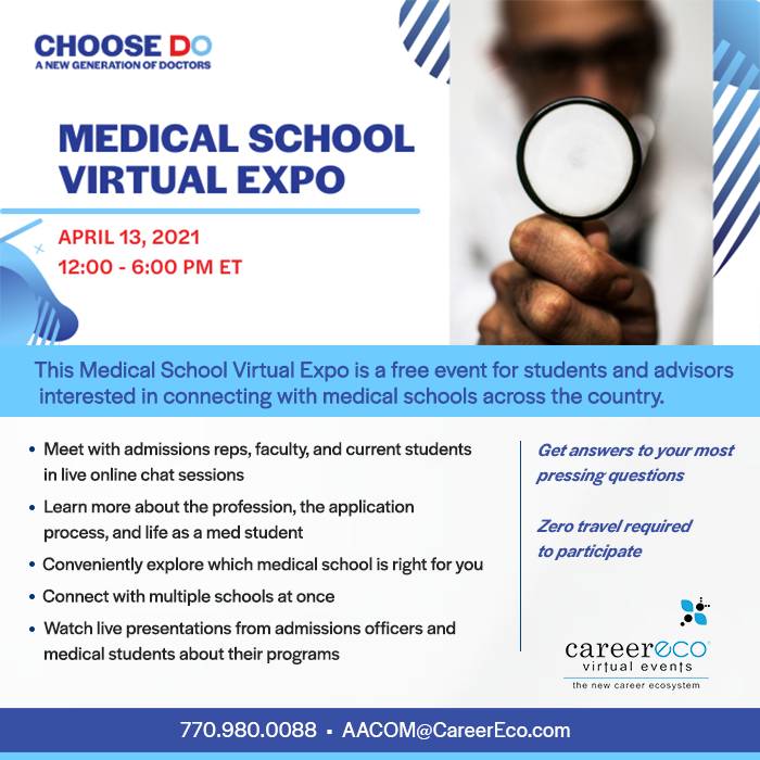 Click here for information about the Medical School Virtual Expo on April 13, 2021, 12 p.m. - 6 p.m.