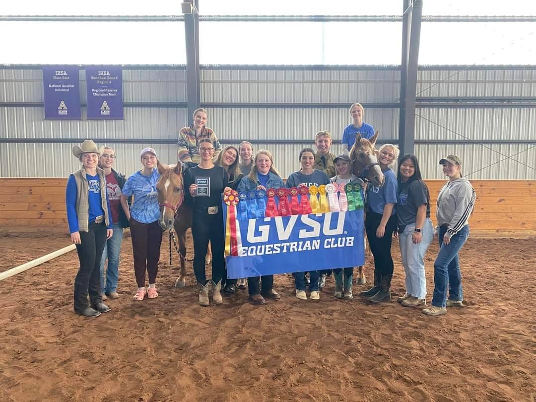 The GVSU Equestrian Team is open to all full-time Grand Valley students who are interested in learning more about horses and riding. We welcome members of all experience levels. Members are not required to compete but may do so as a team member of the Intercollegiate Horse Show Association (IHSA).