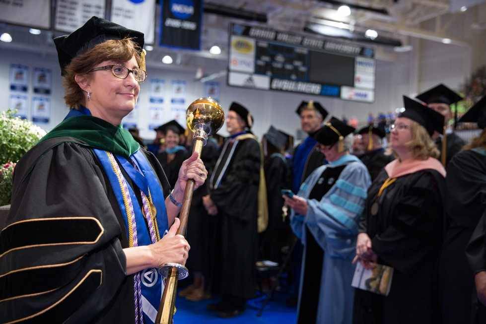 The Grand Valley mace was used for the first time in the 1983 commencement ceremonies. The mace was designed by Beverly Seley, GVSU associate professor of art, and executed by students in her metalsmithing class.