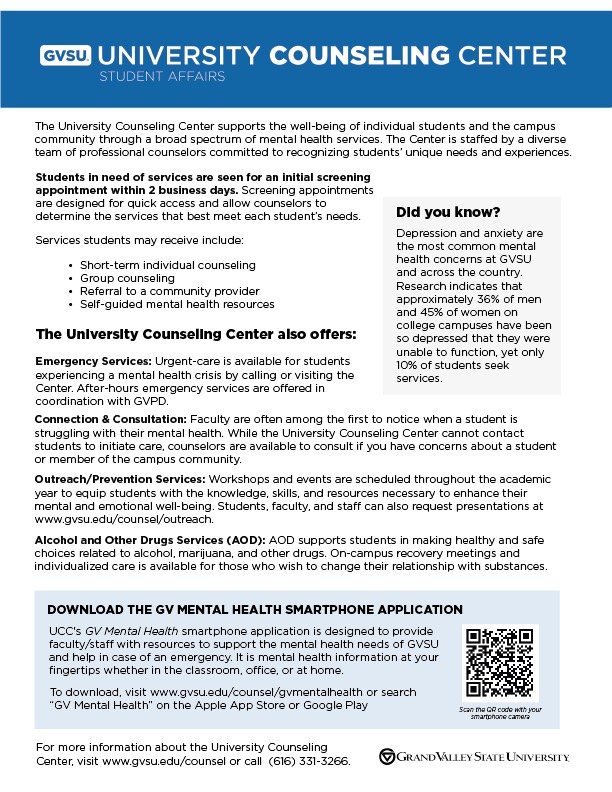 Note: all services are provided free of charge to the GVSU community and are designed to respect the confidentiality of those involved.