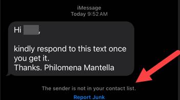 Tip: Here is an example of reported smishing. Notice how the sender is not part of the user's contact list.