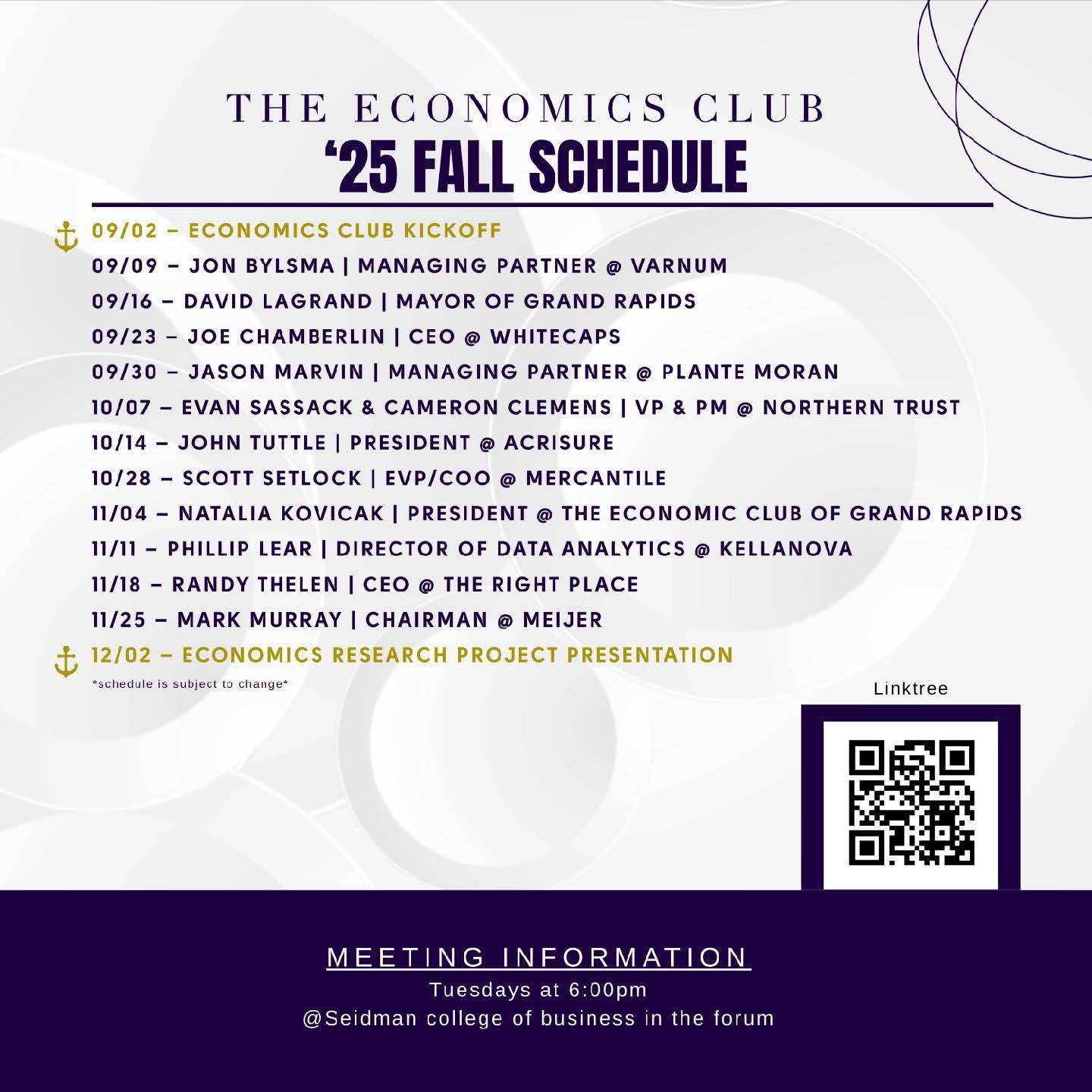 The GVSU Economics Club is a place for all GVSU students to come and explore their love for economics and develop crucial skills that aren’t taught in the classroom. During the 2025-26 school year, the GVSU Economics Club will be bringing in professional speakers from across the Grand Rapids area every week to provide students with knowledge of current economic issues and share their own personal experiences in their professional life. Students will have the opportunity to personally connect with these experts and develop their networking skills. In addition to the speaker events, the GVSU Economics Club will also have other networking, career, and research events to get students prepared for their career after college.