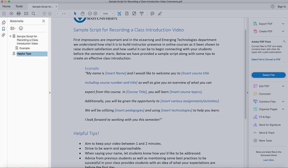 - When opening your PDF in Adobe Acrobat Read DC, double check the accessibility of the document by opening the left navigation panel and clicking the bookmarks tab on the left side of your screen. If you do not see a bookmarks tab then it may not be an accessible document.