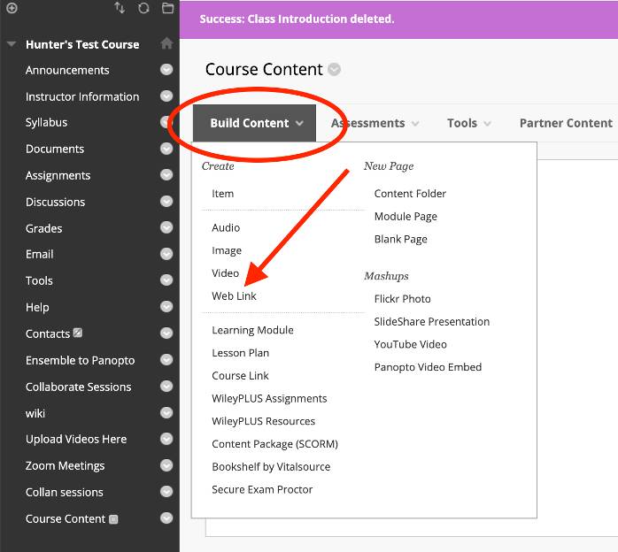 6. Once that is set to the appropriate Behavior setting go to the area in the course you want the Padlet integration (NOTE: Keep the Padlet open in another tab you will need both windows available in a future step) and click “Build Content” then “Web Link”