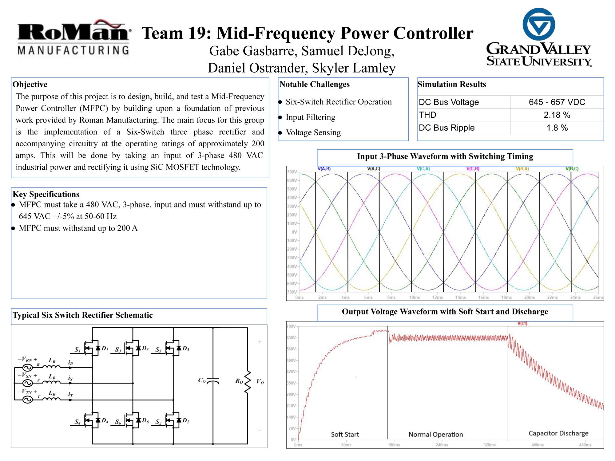 The purpose of this project is to design, build, and verify the implementation of a Mid-Frequency Power Controller (MFPC) by building upon a foundation of previous work provided by RoMan Manufacturing. The focus of the project is to take an input of 3-phase industrial power and convert it to DC using a rectifier. The MFPC will implement different subcircuits to have low harmonic distortion, high efficiency, and a near unity power factor.