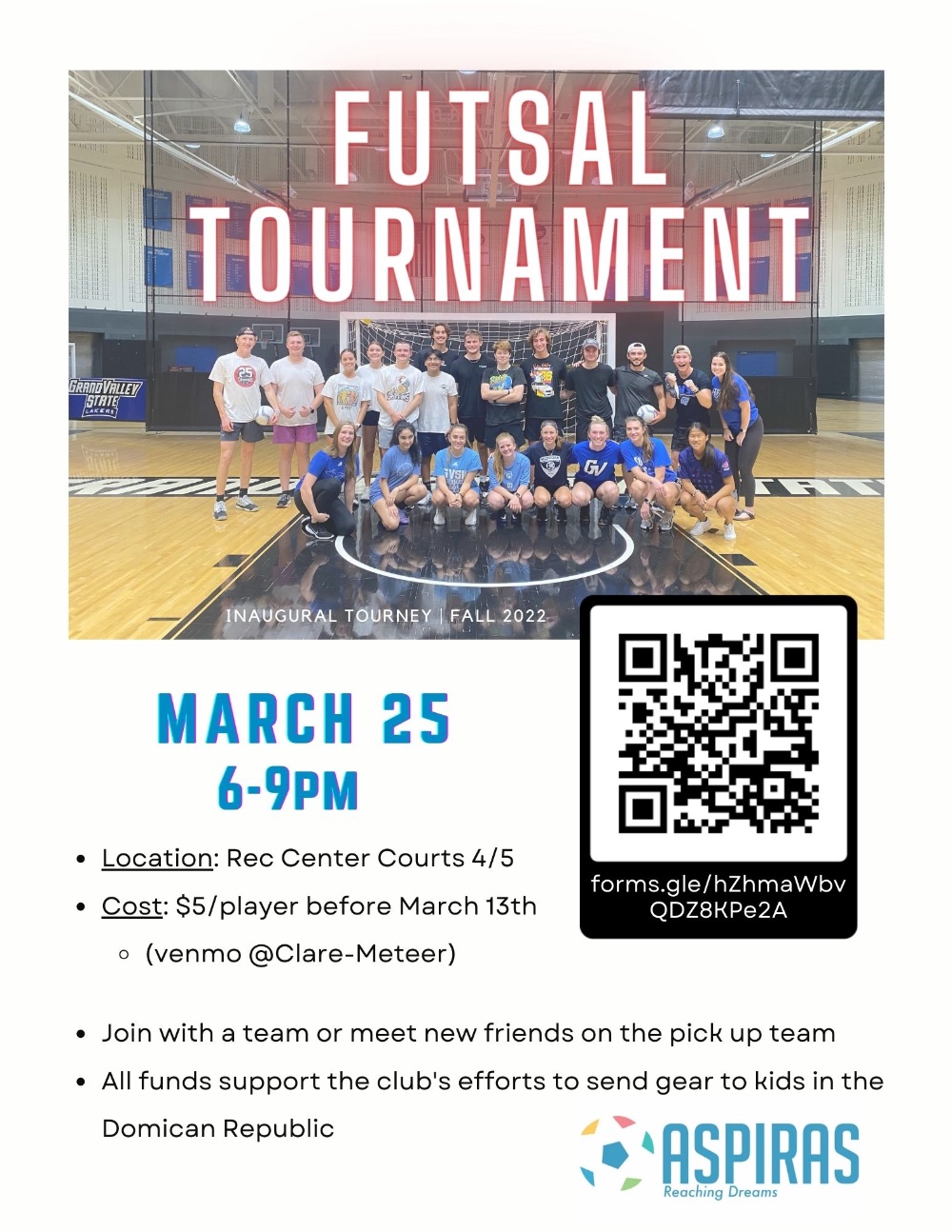 A 5v5 Futsal Tournament to help raise money for shipping gear to the kids in the Dominican Republic to play soccer (football)