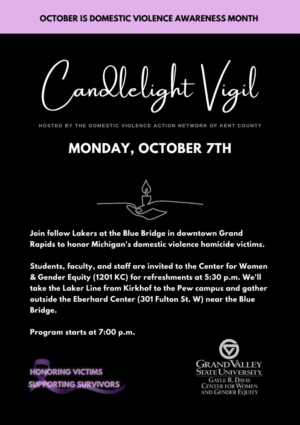 October is Domestic Violence Awareness Month. Honor victims and support survivors by joining fellow Lakers at the Blue Bridge in downtown Grand Rapids. Students, faculty, and staff are invited to the Center for Women & Gender Equity (1201 KC) for refreshments at 5:30 p.m. We'll take the Laker Line from Kirkhof to the Pew campus and gather outside the Eberhard Center (301 Fulton St. W) near the Blue Bridge. This event is hosted by the Domestic Violence Action Network of Kent County. Program begins at 7:00 p.m.