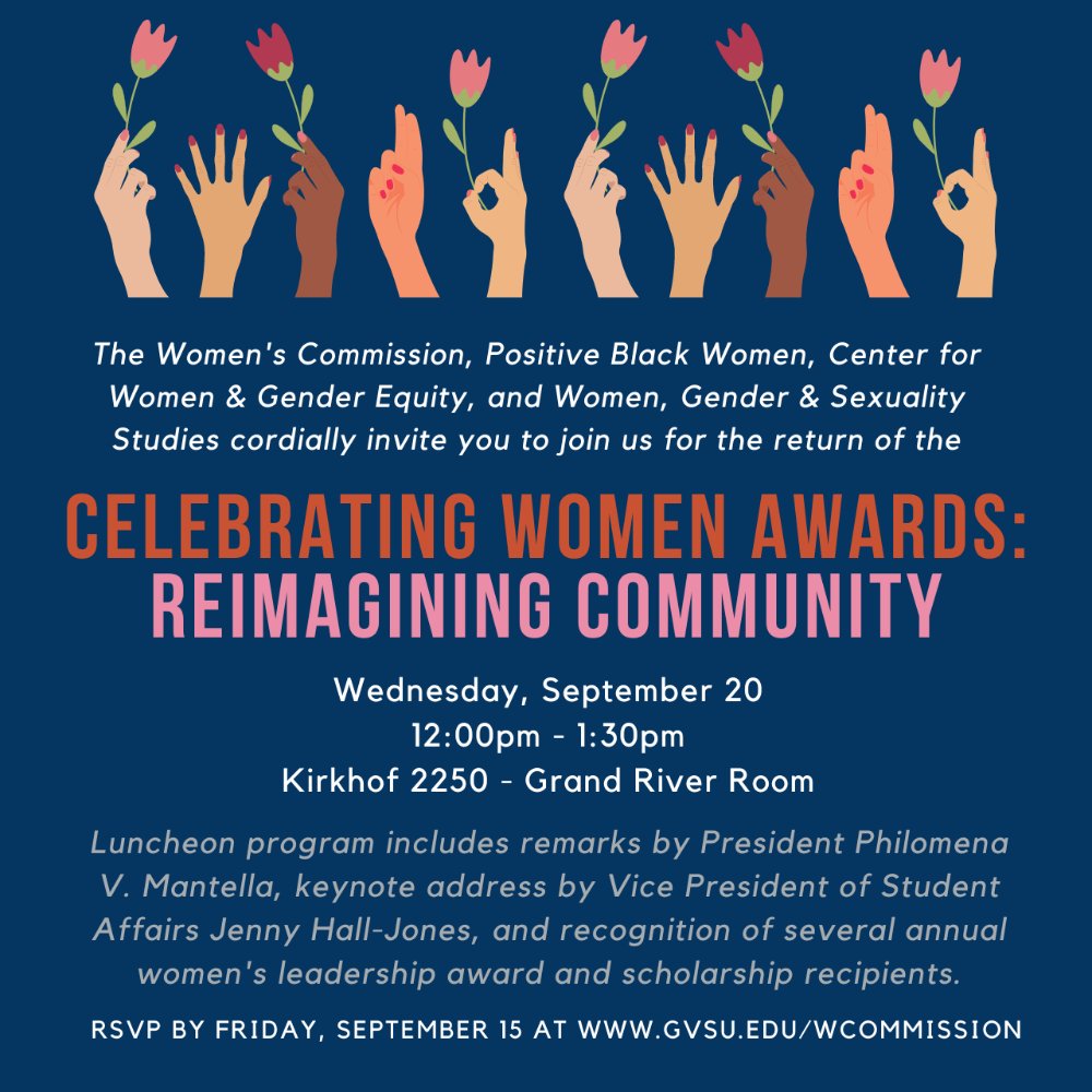 The Women's Commission would like to invite you to our fall event, the Celebrating Women Awards Luncheon: Reimagining Community. Featuring a light lunch, we will gather together to celebrate the kickoff to the fall semester as well as our award nominees for the Center for Women and Gender Equity, Women & Gender Studies, Positive Black Women, the Women's Commission, and Athletics. Please RSVP by September 8. Registration Here!
