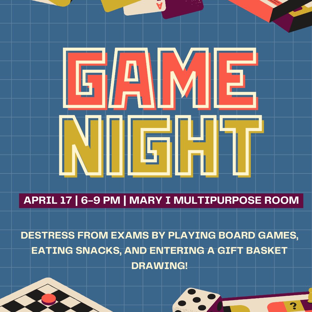 The Exam Jam Board Game Night is an event intended for students to take a break from studying to play some board games. The Board Game Night is a wellness activity for students to relieve stress and give their brains a healthy break from studying.