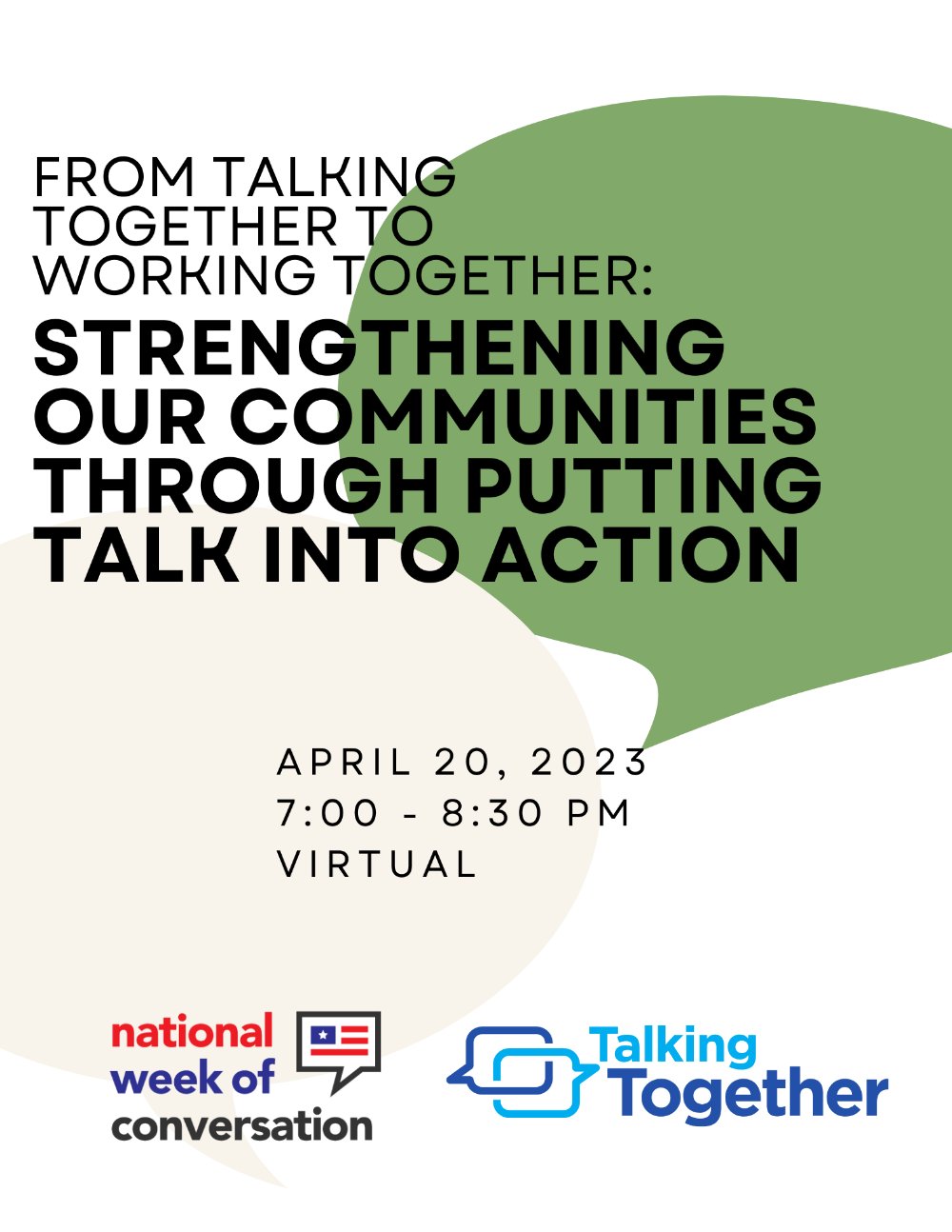 Please join us for this final Talking Together event and be a part of this year’s National Week of Conversation (April 17-23), a week annually dedicated to bridging divides across the country through conversation. It is a week inspired by the transformative power of conversation and the bridge-building that can emerge when people actively listen to one another, remain curious about each other, and honor multiple perspectives.