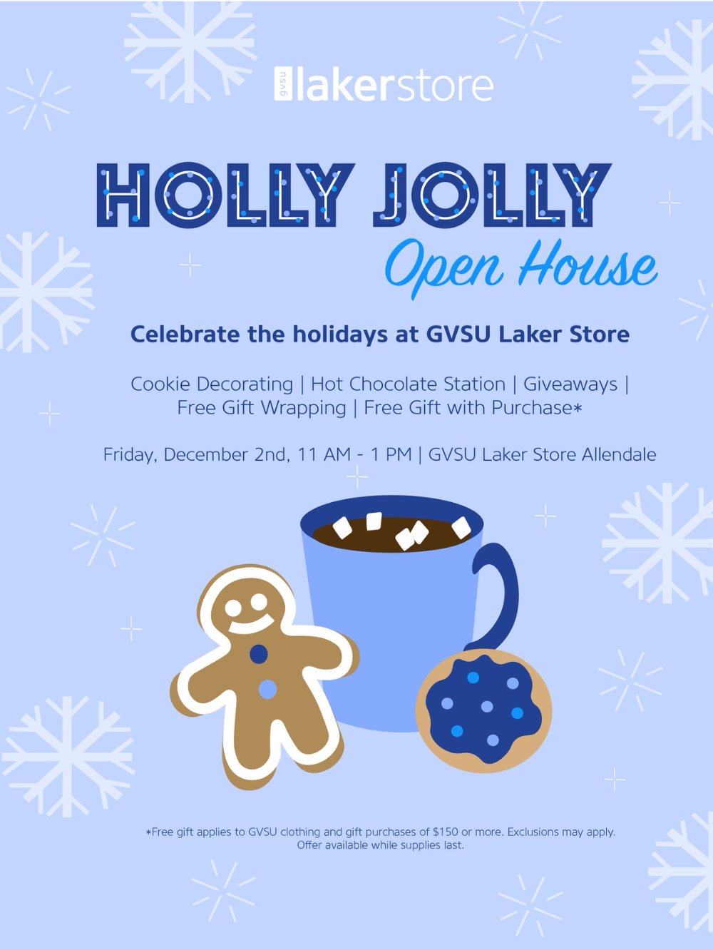 Celebrate the holidays at GVSU Laker Store. Cookie decorating station & hot chocolate bar compliments of Laker Food Co. Giveaways & free gift-wrapping. And free holiday gift with apparel & gift purchases of $150 or more. Make sure you get your GVSU squishy unicorn before they're gone!