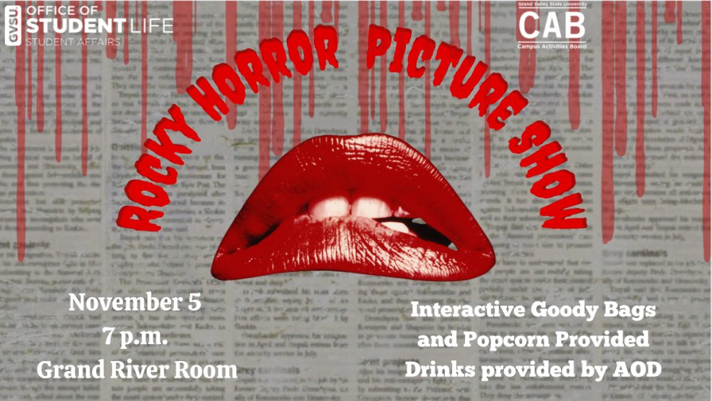 Join the Campus Activities Board for an interactive showing of the classic Rocky Horror Picture Show on November 5th at 7 p.m. in the Grand River Room. Popcorn and mocktails from AOD will be provided. A Rocky Horror Show themed costume contest will take place before the movie.