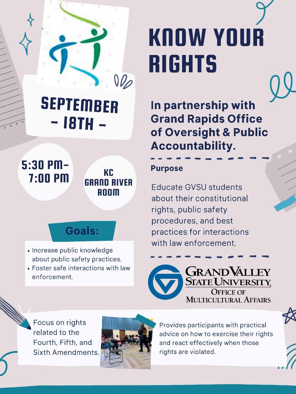 In partnership with Grand Rapids Office of Oversight & Public Accountability. Program will educate GVSU students about their constitutional rights, public safety procedures, and best practices for interactions with law enforcement.