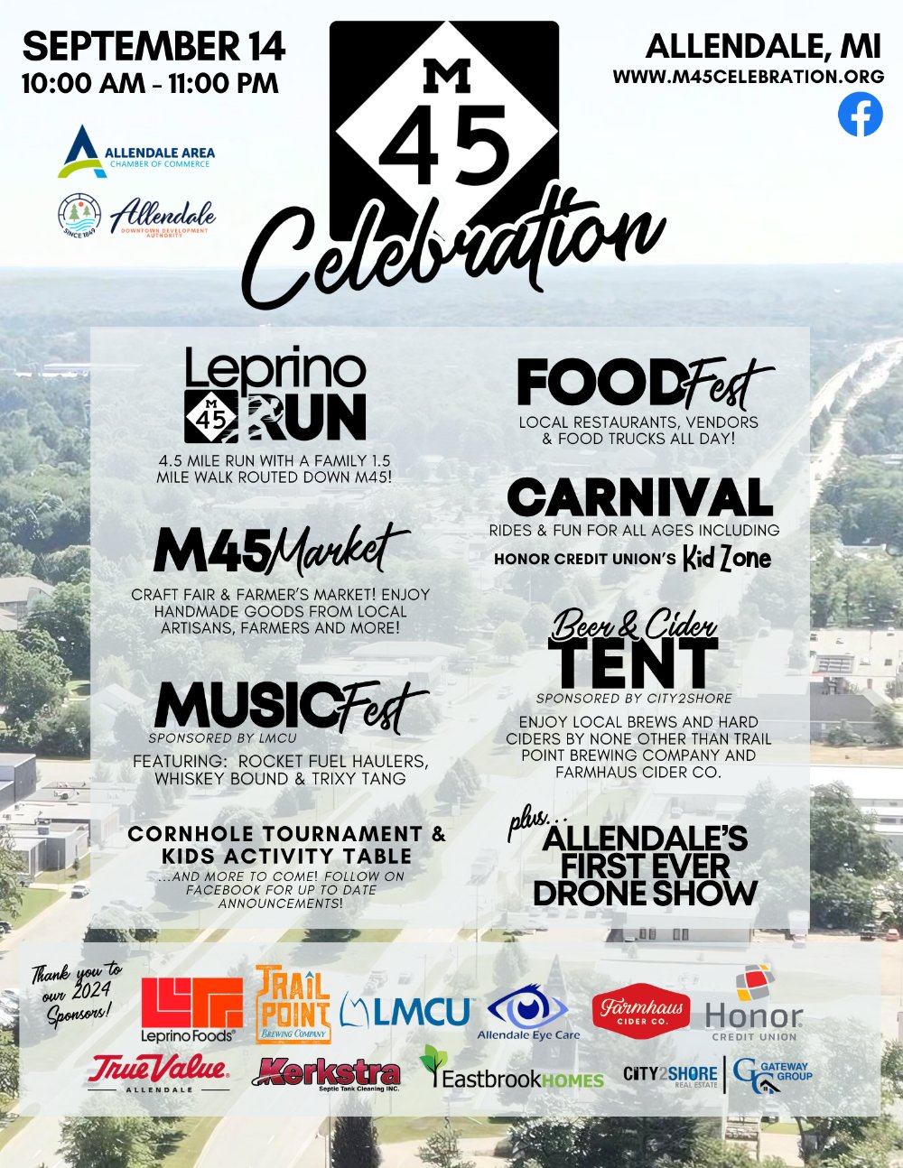 Celebrate 175 Years of Allendale with our first ever M45 Celebration. Sponsored by Allendale Area Chamber of Commerce, Allendale Township and Local businesses. There will be a wide variety of events including a Fun Run and Walk, Carnival and Rides, Taste of Allendale and Live Music all day! Students, Staff, Faculty and Community are encouraged to attend and participate. Volunteer opportunities are available.