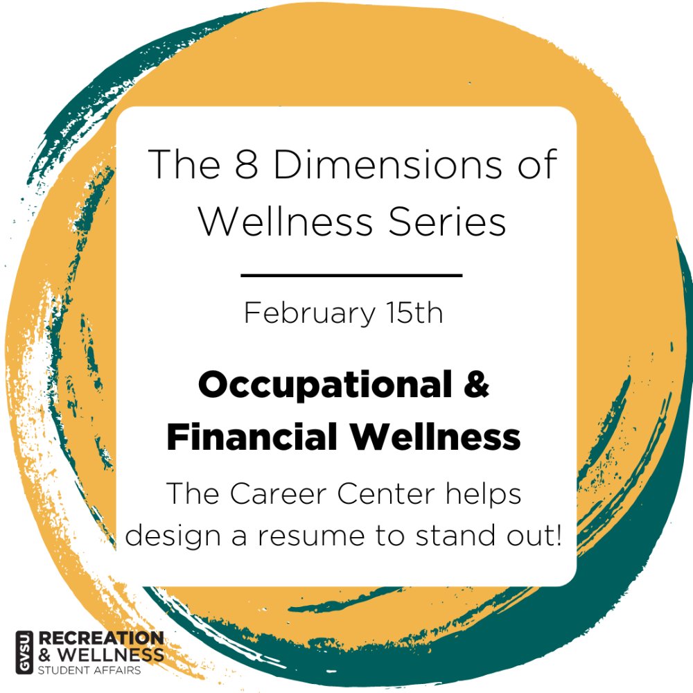 This month is all about being financially and occupationally well. Occupational Wellness is your involvement in activities like volunteering, employment, or career preparation. It also includes your balance between these things and the time you have for things you enjoy like friends, exercising, or whatever you do to relax. Financial wellness includes things like your income, savings, and expenses as well as how you understand your financial situation and resources. This event will help with career preparation and give you the tools for occupational and in turn, financial success!