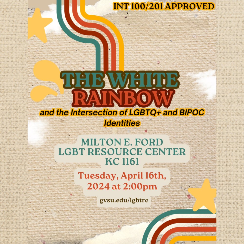 Join us for a student-led, INT 100/201 approved presentation and discussion about white-washing in LGBTQ+ past and present, and the intersection of being a queer person of color in America. There will be a Zoom link available as well, just email [email protected] for access.