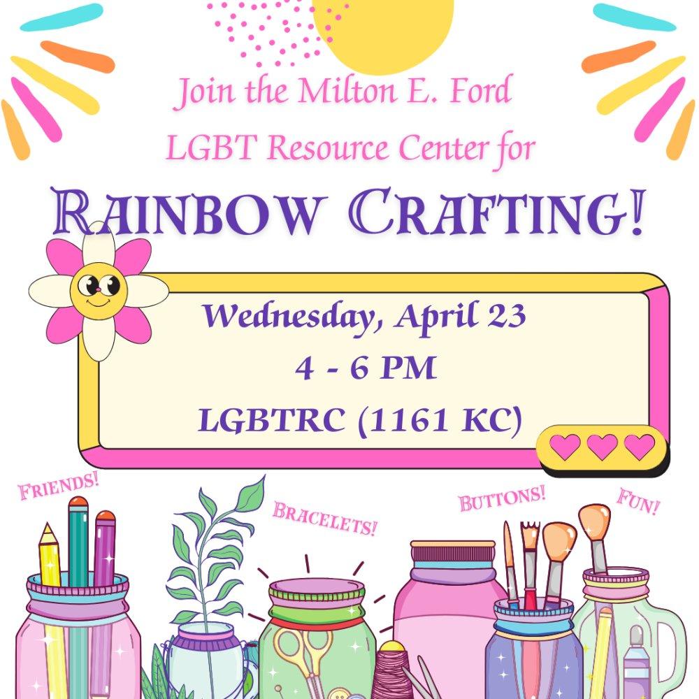 Drop into the LGBT Resource Center for some free rainbow crafting during exam jam! There will be supplies for beading, bracelets, and button-making. Coloring sheets and origami paper will also be available. Give your brain a relaxing break and enjoy some time in our cozy space!