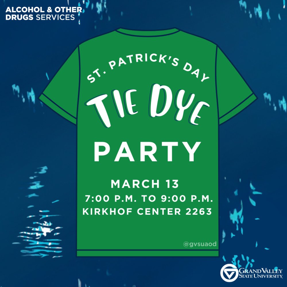 Join Alcohol and Other Drugs Services to tie dye a free shirt and learn how you can be safe, smart, and responsible this St. Patrick's weekend!