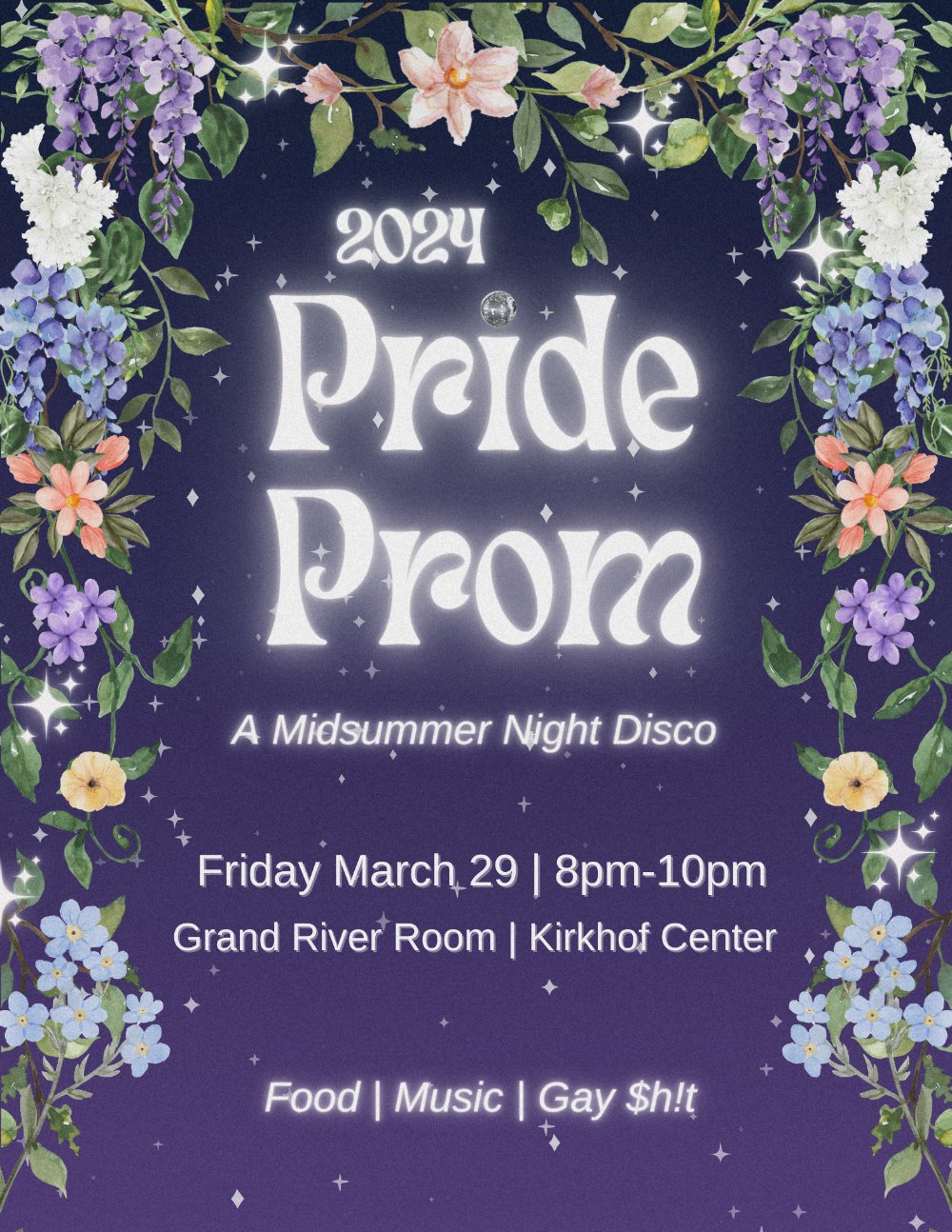 An annual, student-led formal extravaganza, join us for Pride Prom 2024! Supported by the LGBT Resource Center, students on the Pride Prom committee are prepared to bring you a night of music, food, and fun. Please stay tuned for more details! This is a GVSU students-only event unless you are an invited guest.