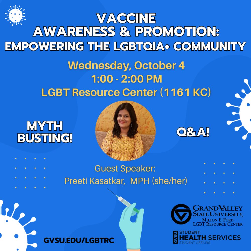 The Community Health Advisory Team member will host an in-person educational event on vaccine awareness and promotion for GVSU, specifically focused on empowering the LGBTQIA+ community here. You can expect to learn about the flu, covid-19, and m-pox vaccines, and we will also do some myth-busting about vaccines in general. This event will be led by Preeti Kasatkar (she/her), MPH and the Community Health Specialist at Student Health Services. CHAT is composed of university employees and a representative from Trinity Health, which operates the Campus Health Center on the Allendale Campus. The GVSU Health Hub details health centers on the Allendale and Pew Grand Rapids campuses and shares health and well-being resources for the campus community.