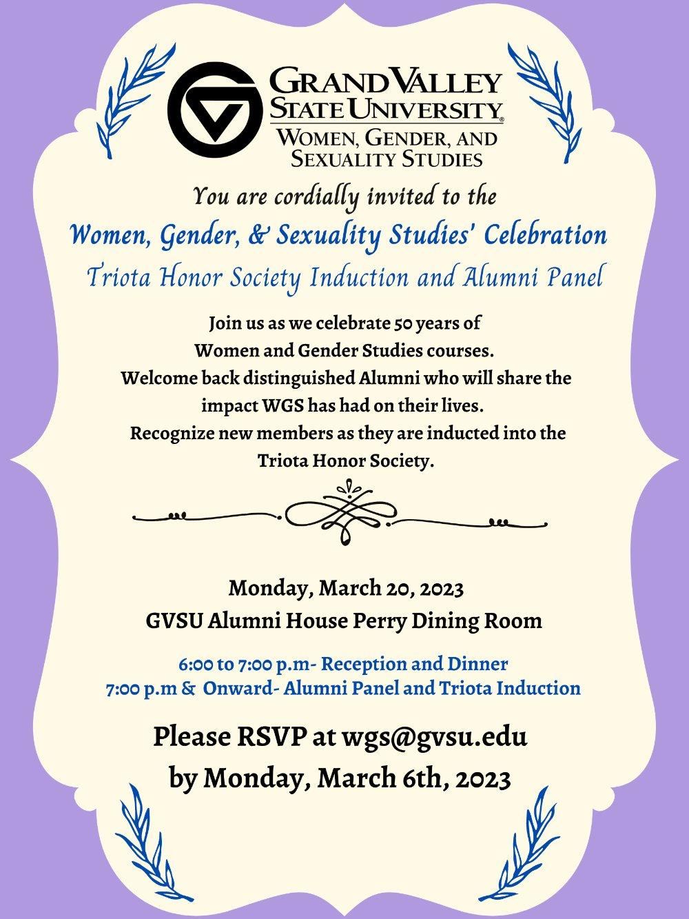 Join us as we celebrate 50 years of Women and Gender Studies courses. Welcome back distinguished Alumni who will share the impact WGS had had on their lives. Recognize new members as they are inducted into the Triota Honor Society.