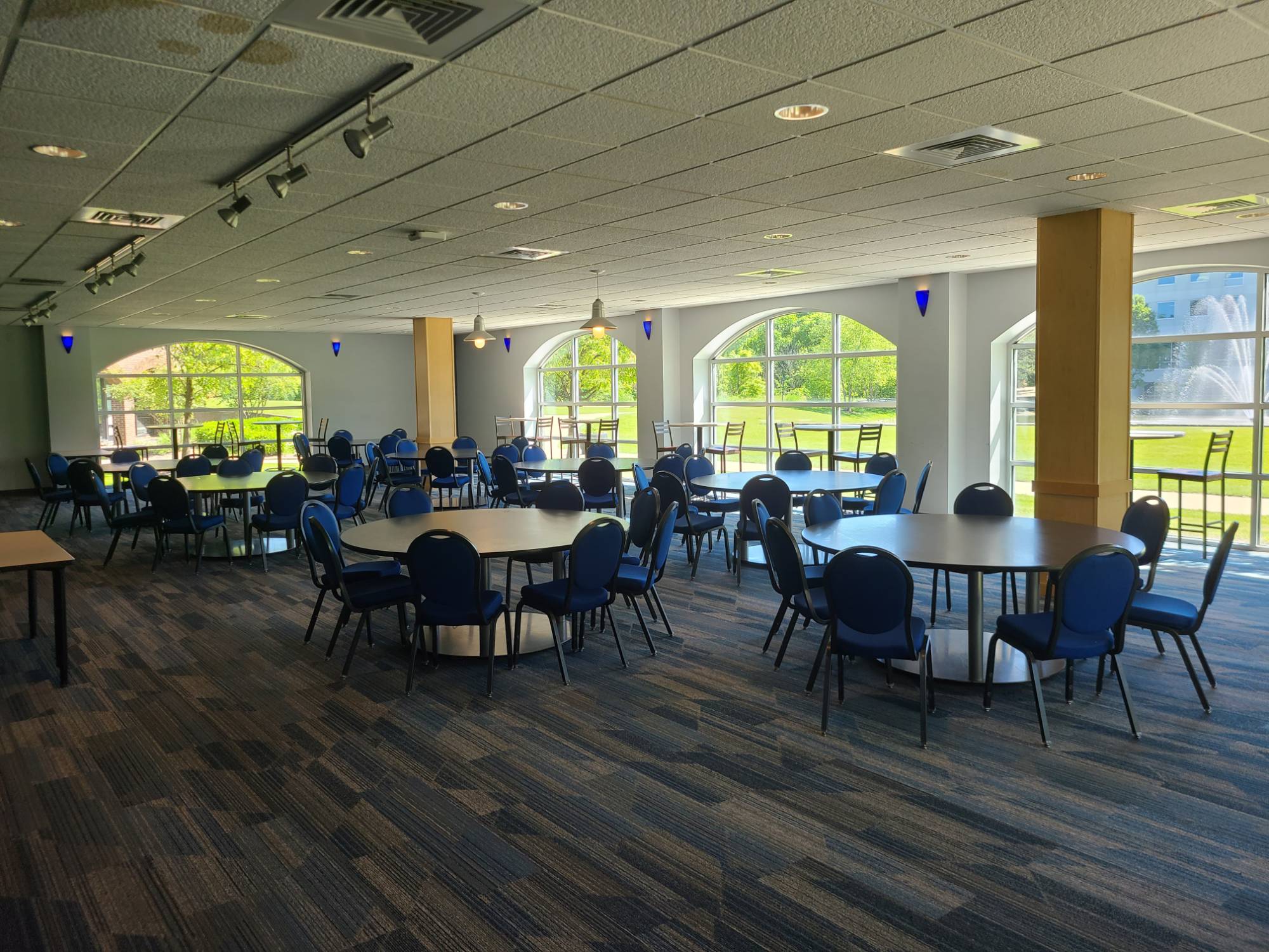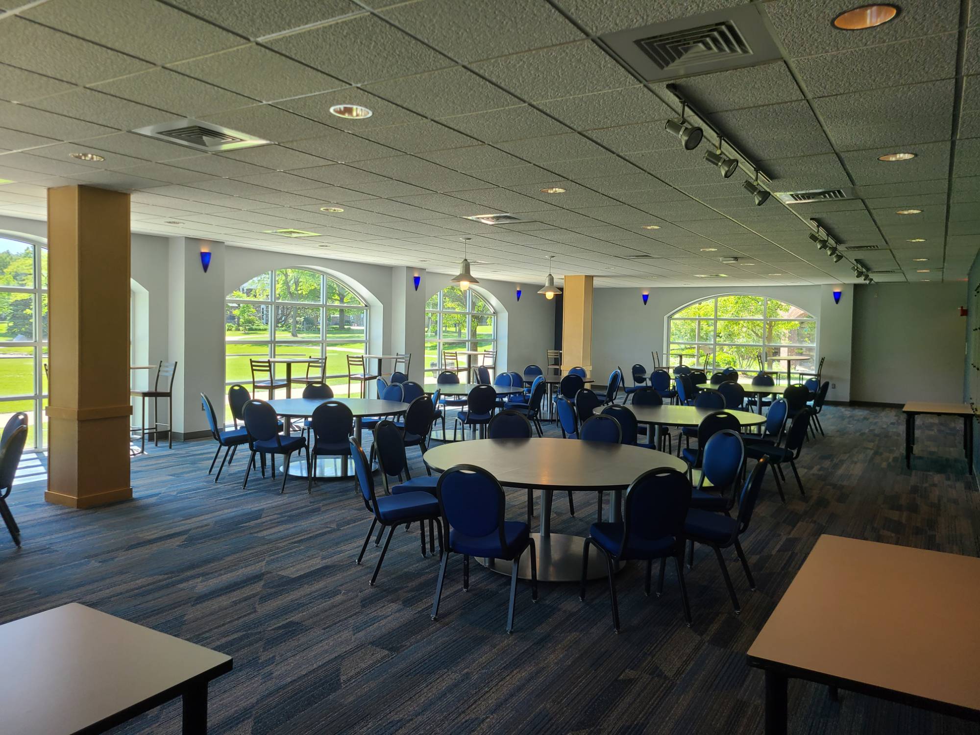 Contact Event Services regarding availability. Thornapple is an as-is room with banquet rounds for 80 and a few high top tables around the perimeter. It features an in-house audio system with microphones and an input for a laptop or tablet for music.