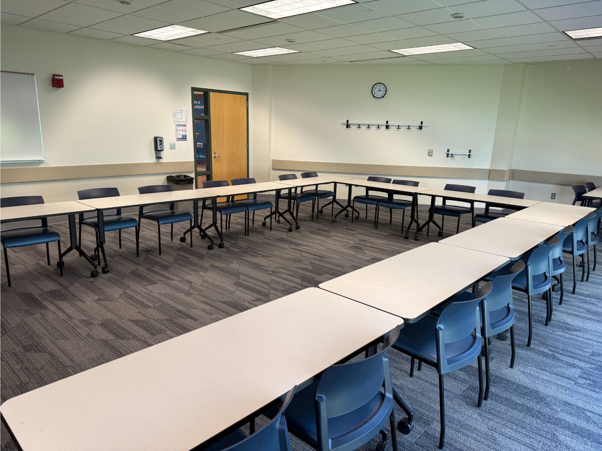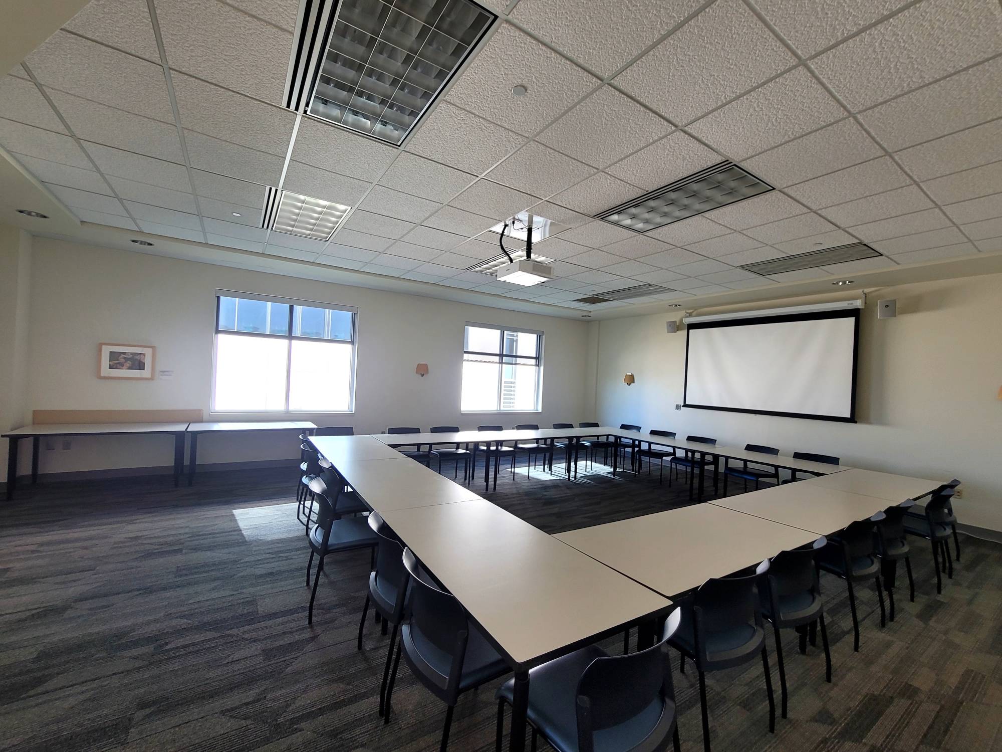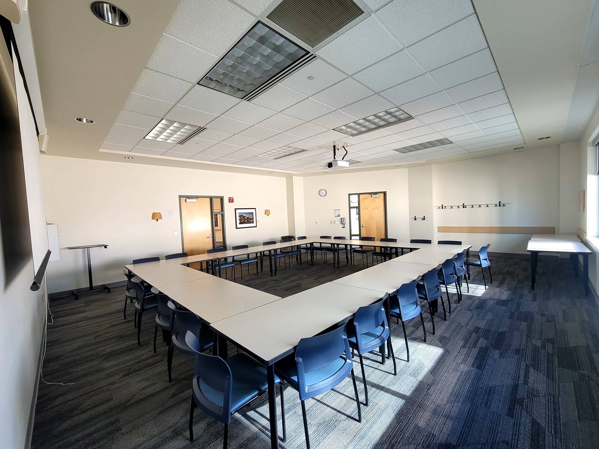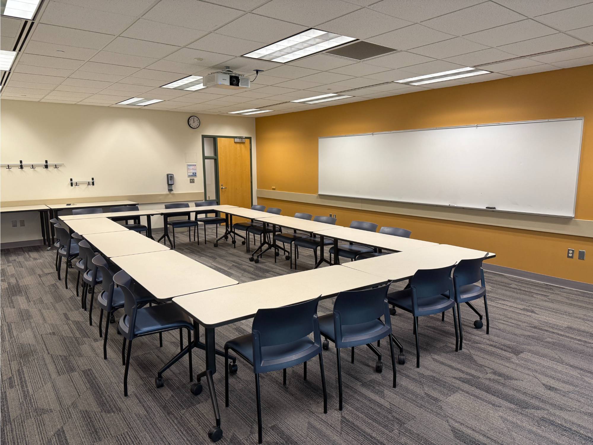 This room has Verb tables which are great as they fold up and are on wheels. The rooms that have these tables can be setup in whatever way you sees fit. Hollow Square, Seminar, and U-shaped are the most common.