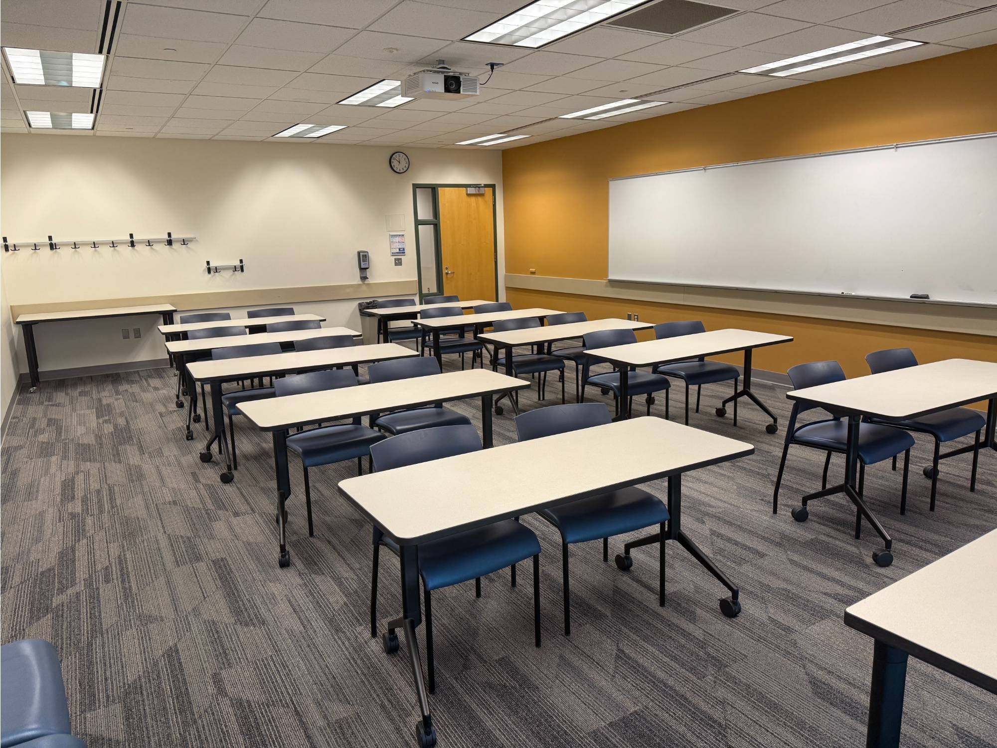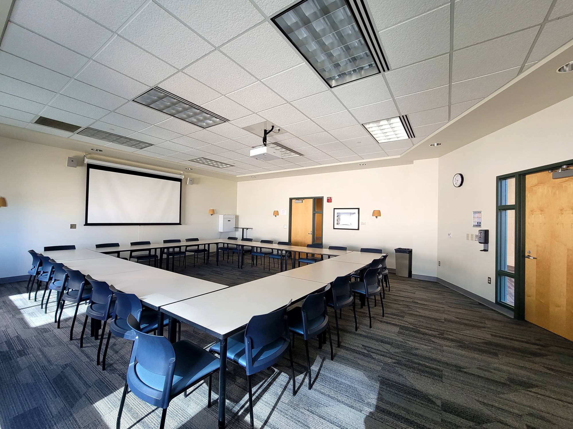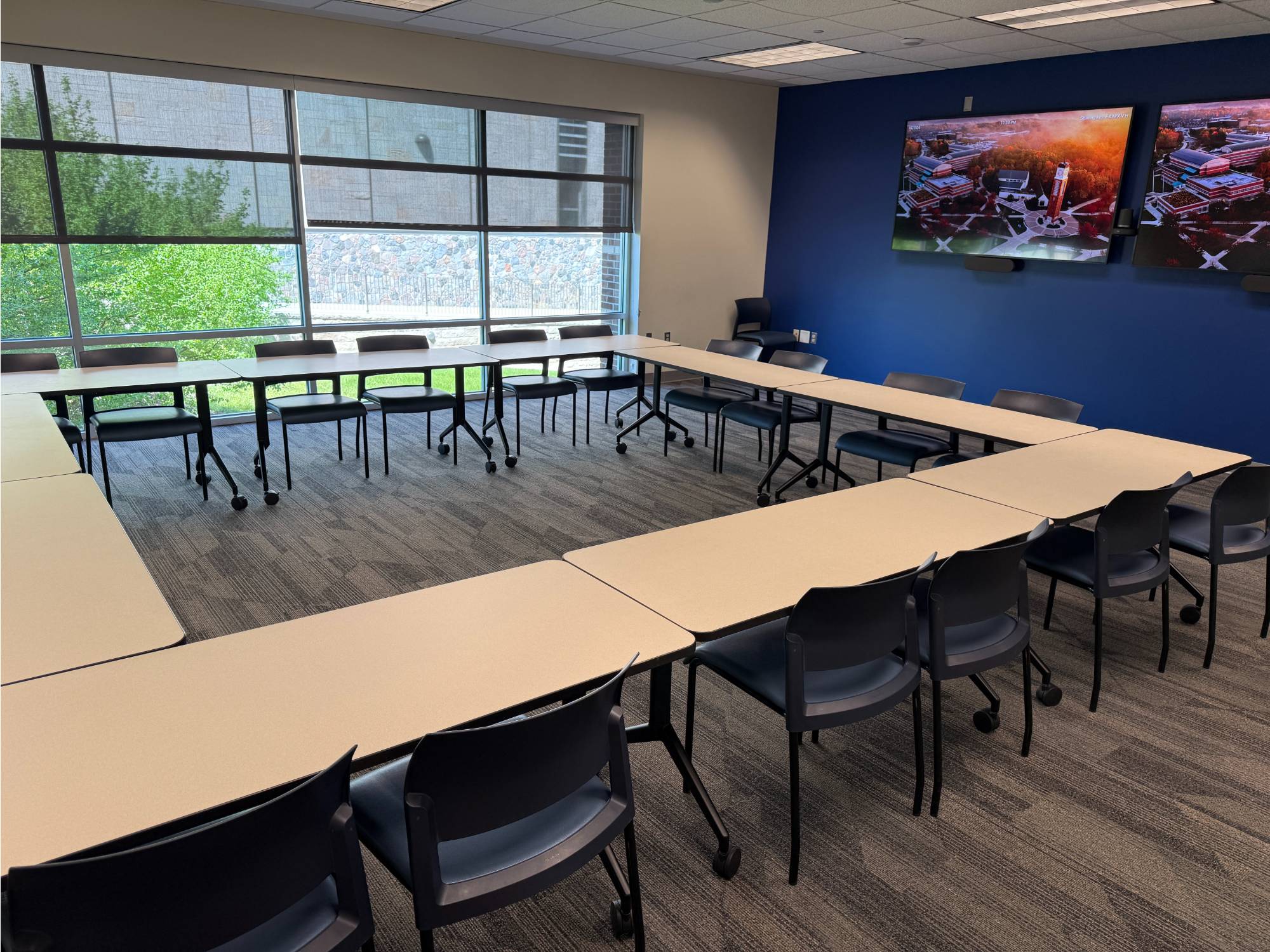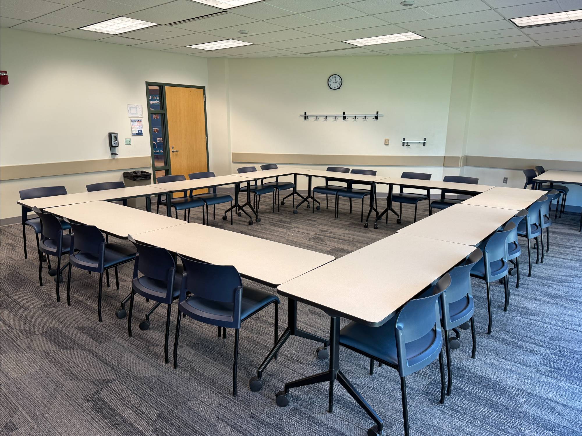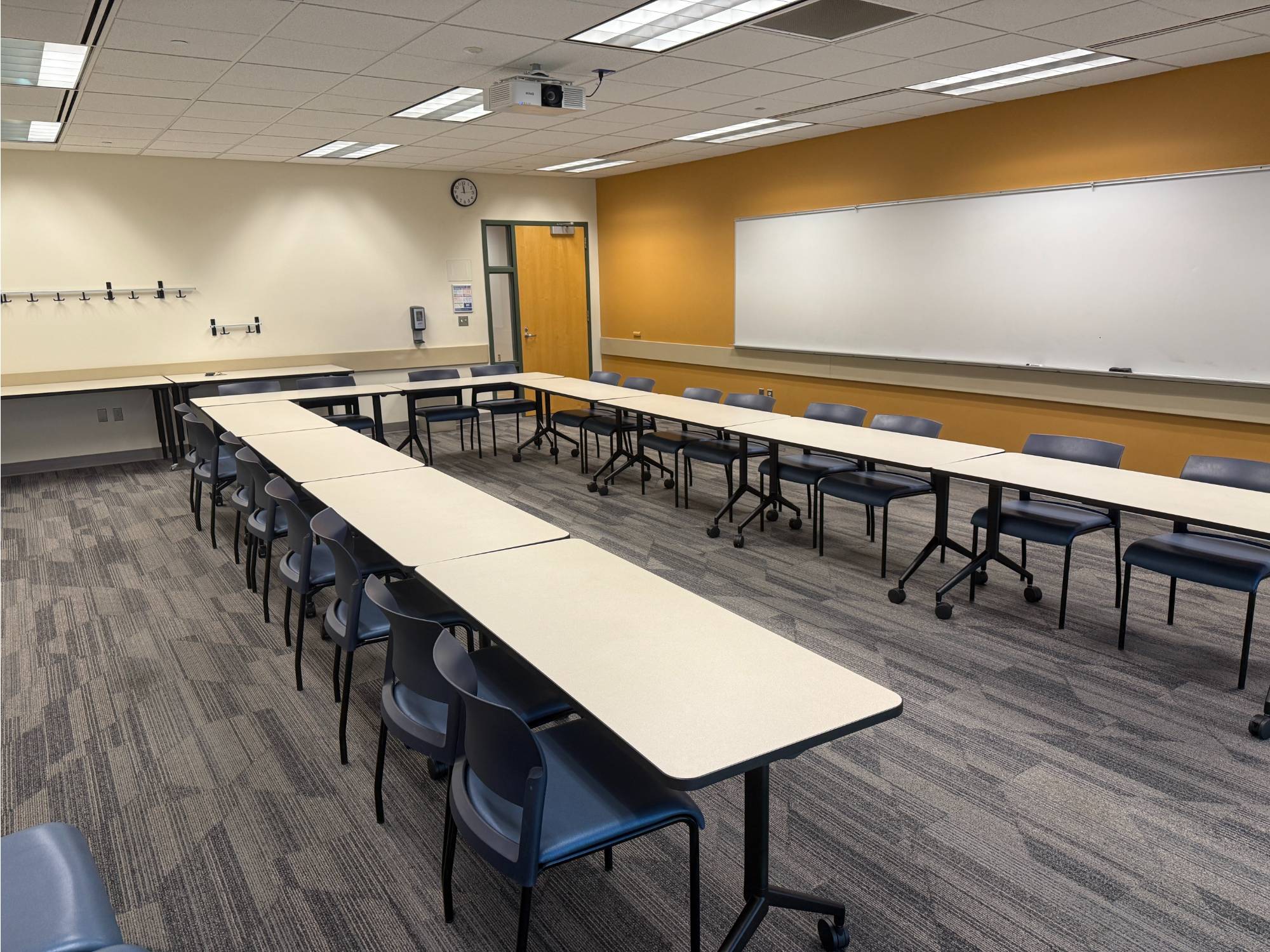 This room has Verb tables which are great as they fold up and are on wheels. The rooms that have these tables can be setup in whatever way you sees fit. Hollow Square, Seminar, and U-shaped are the most common.
