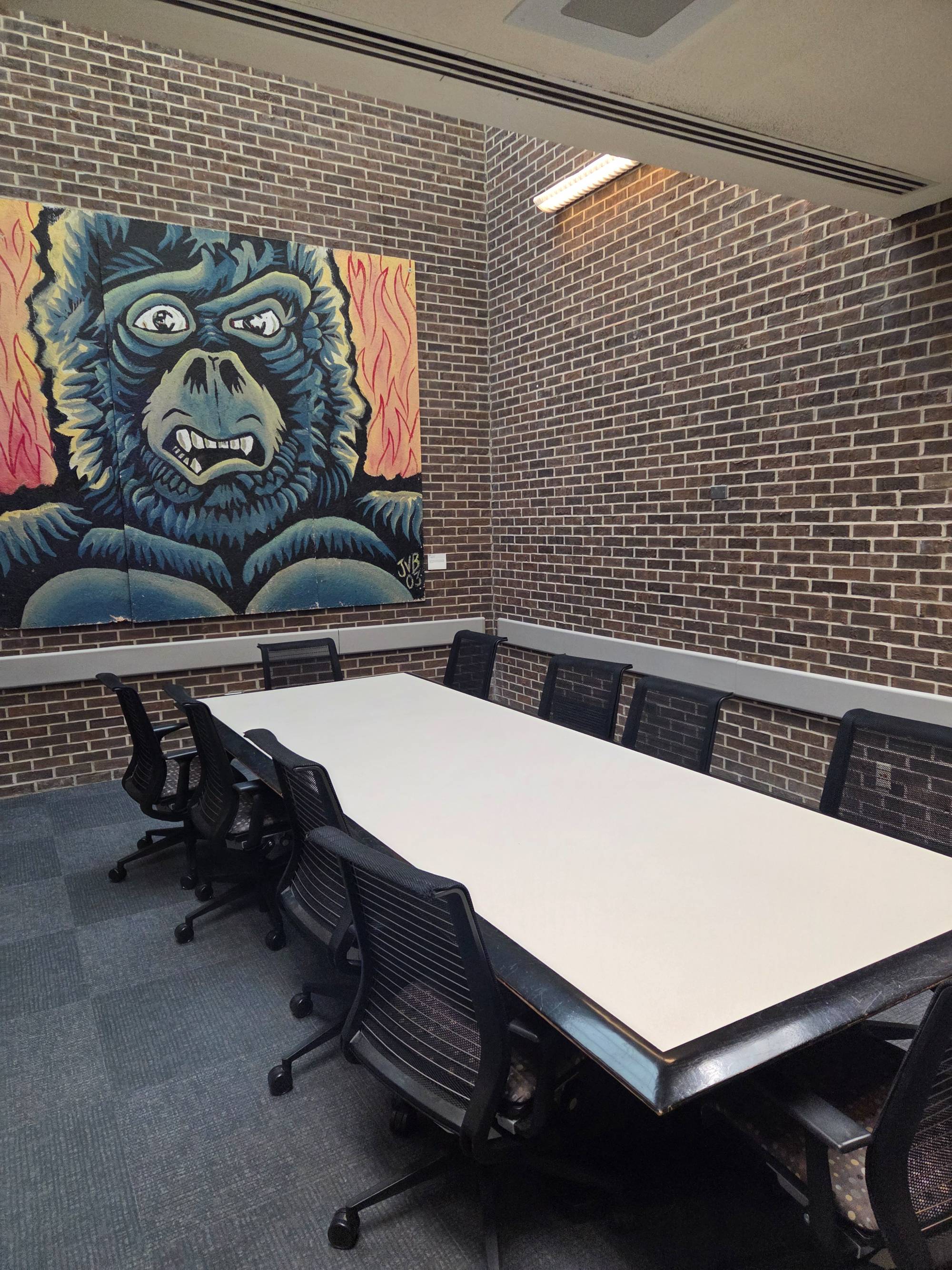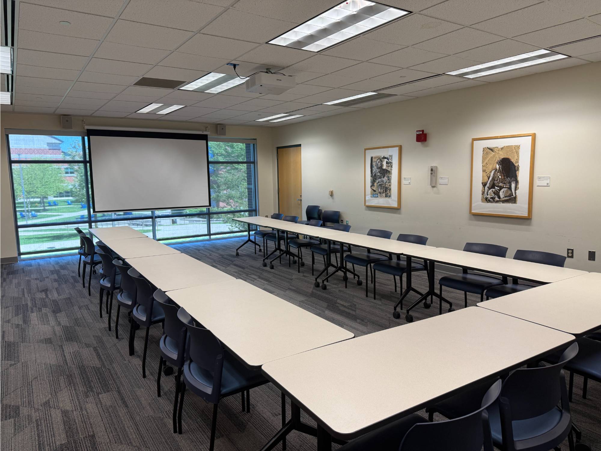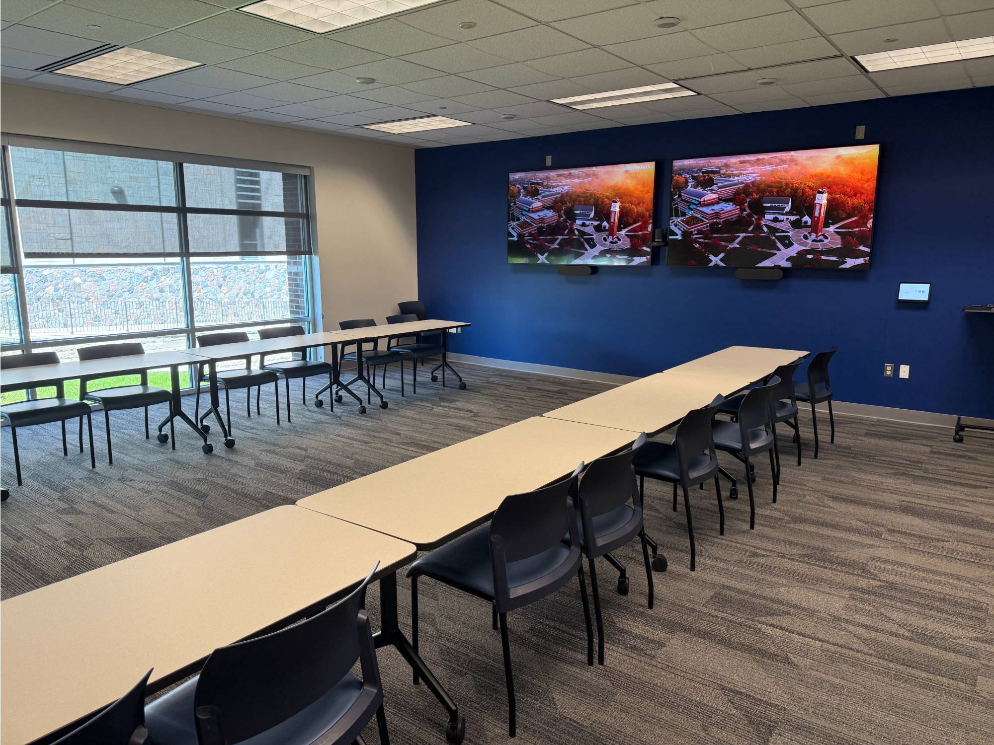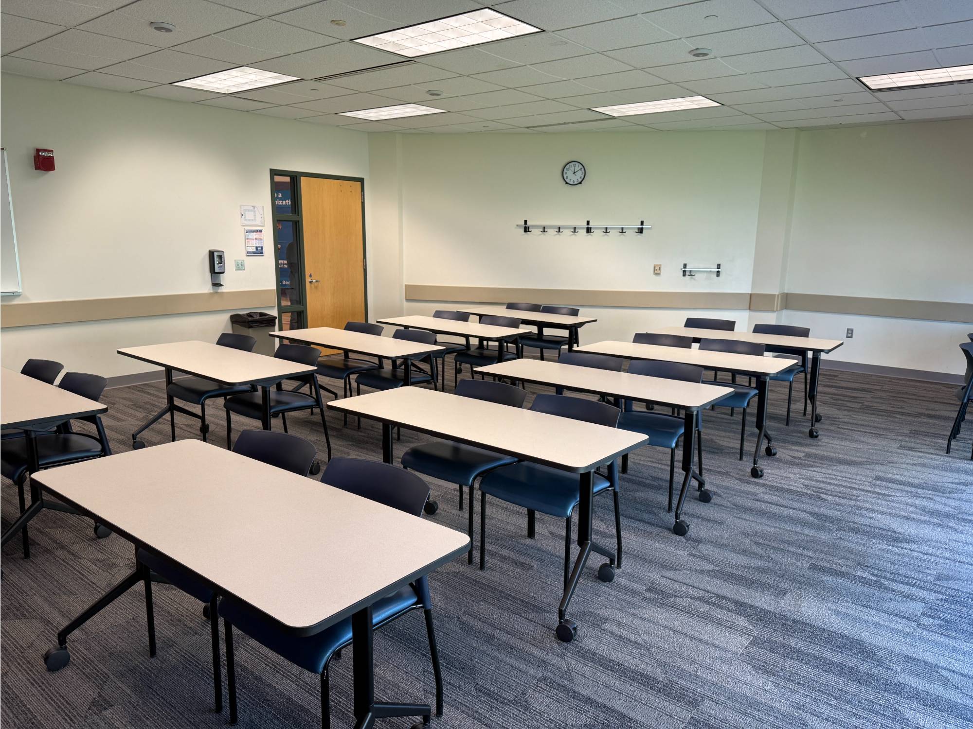 This room has Verb tables which are great as they fold up and are on wheels. The rooms that have these tables can be setup in whatever way you sees fit. Hollow Square, Seminar, and U-shaped are the most common.