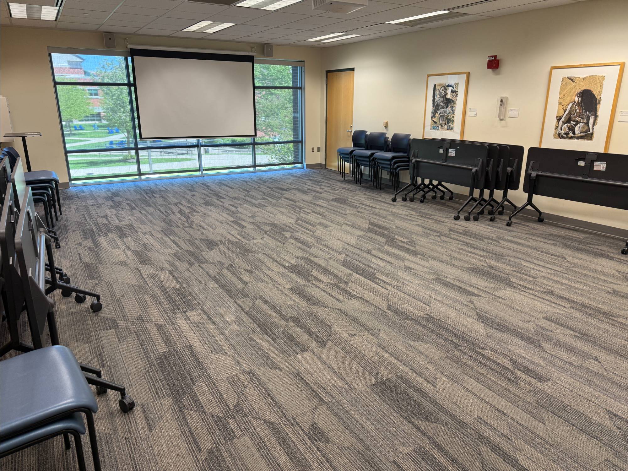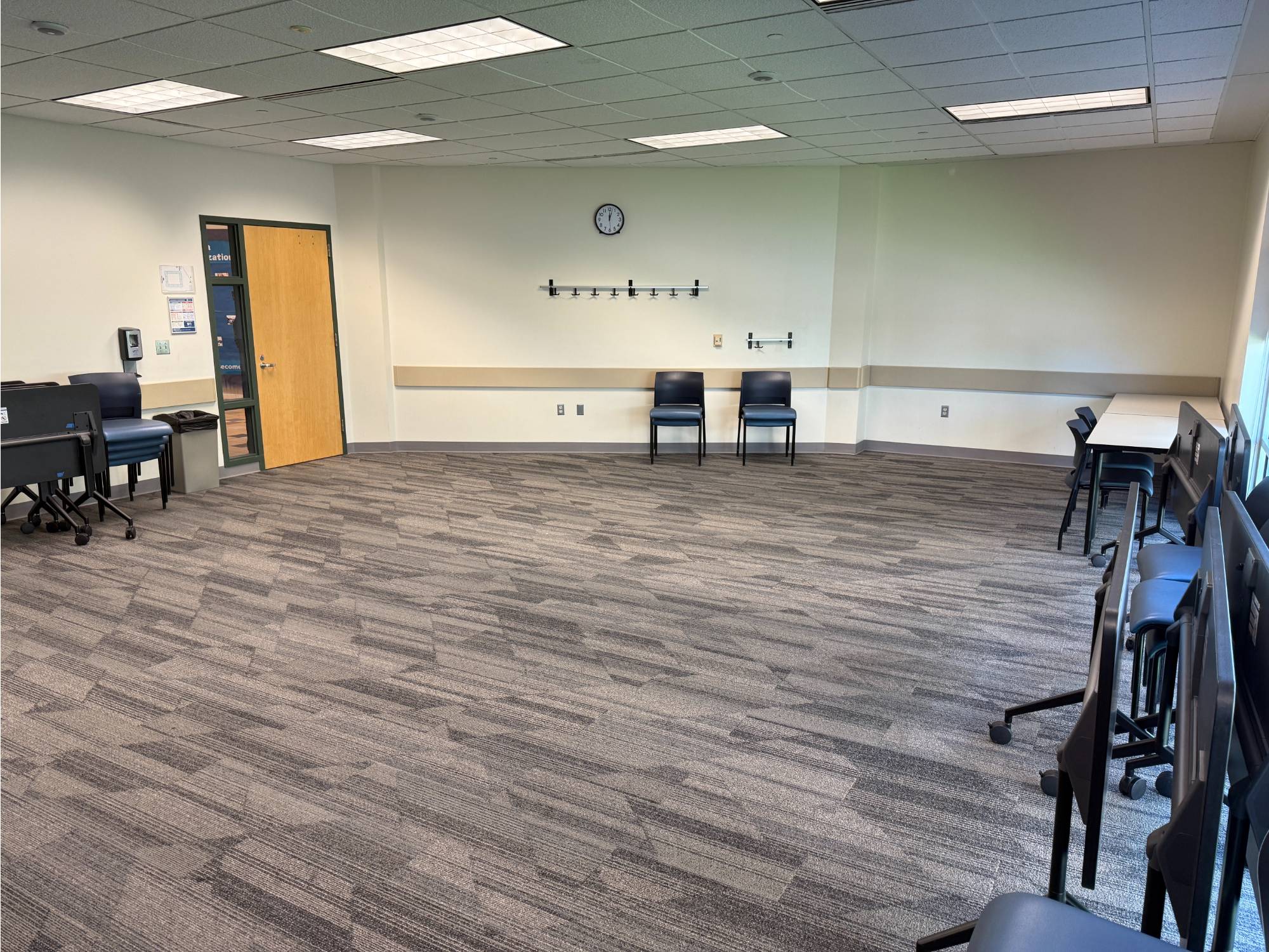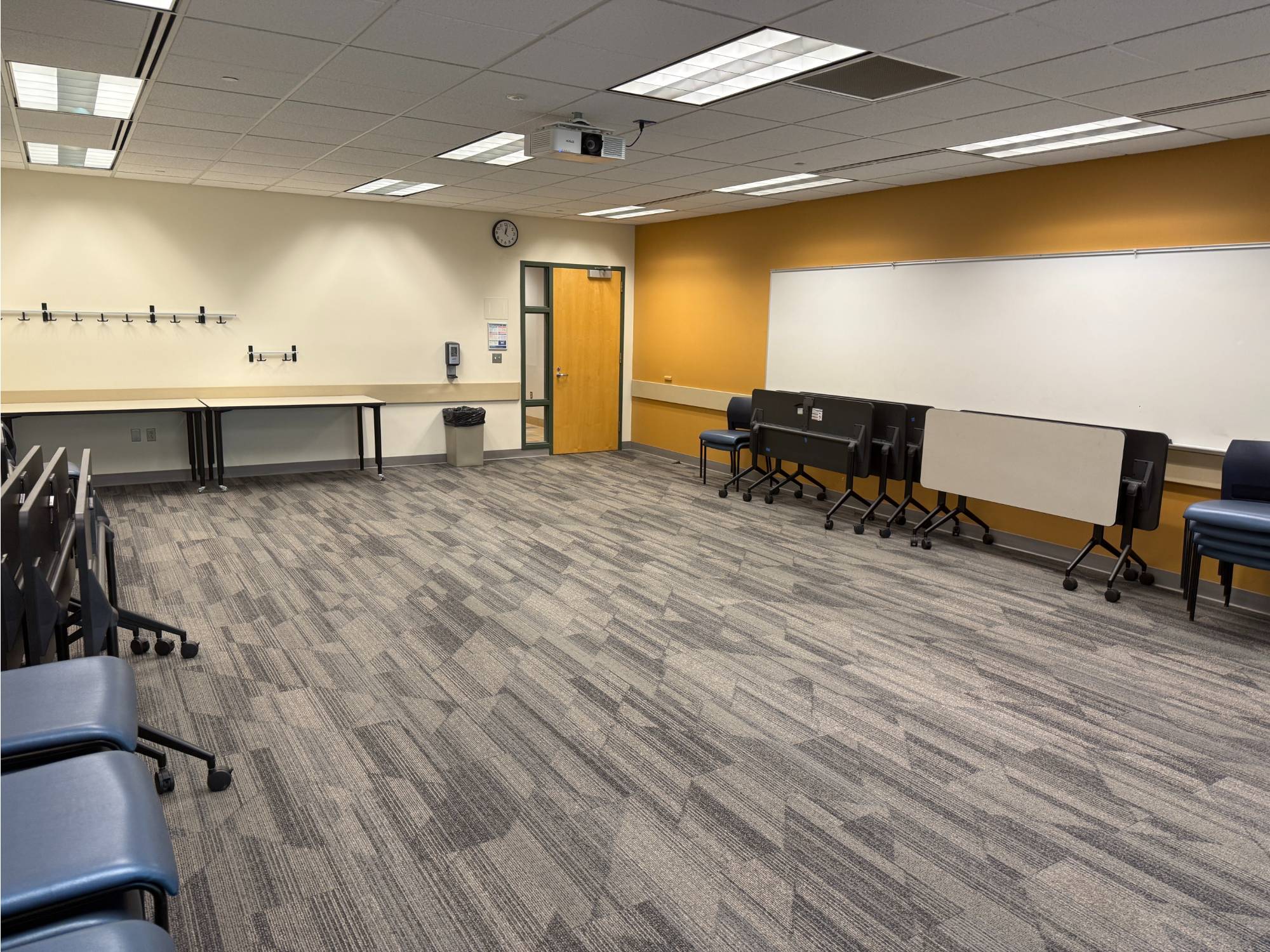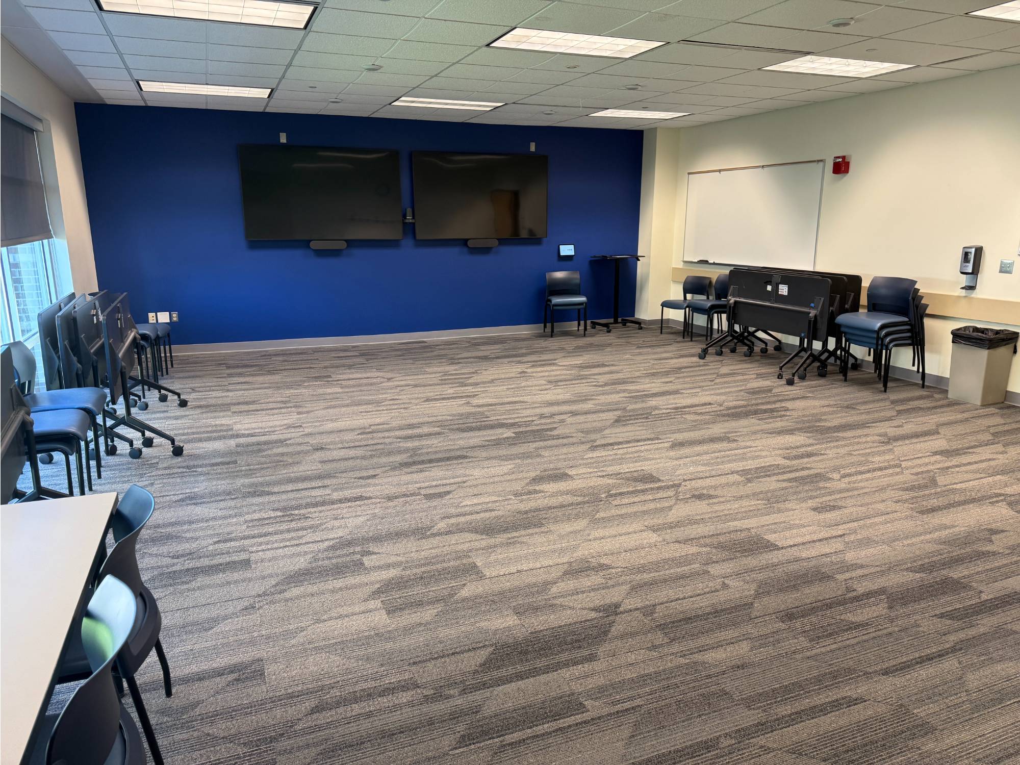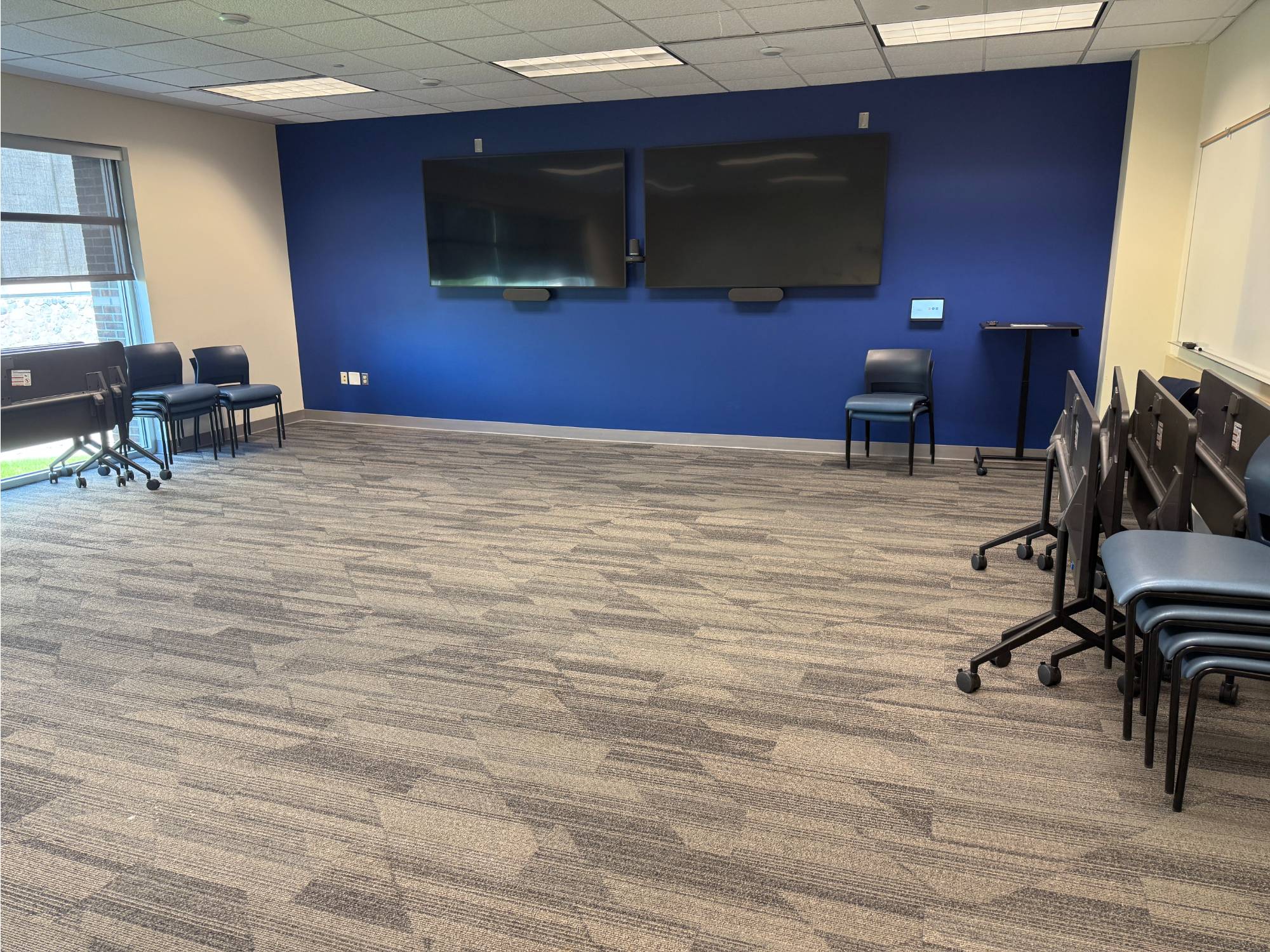 This is a smaller room that does not have installed A/V equipment, but televisions on carts, small portable sound systems, and mobile dry erase boards are available.