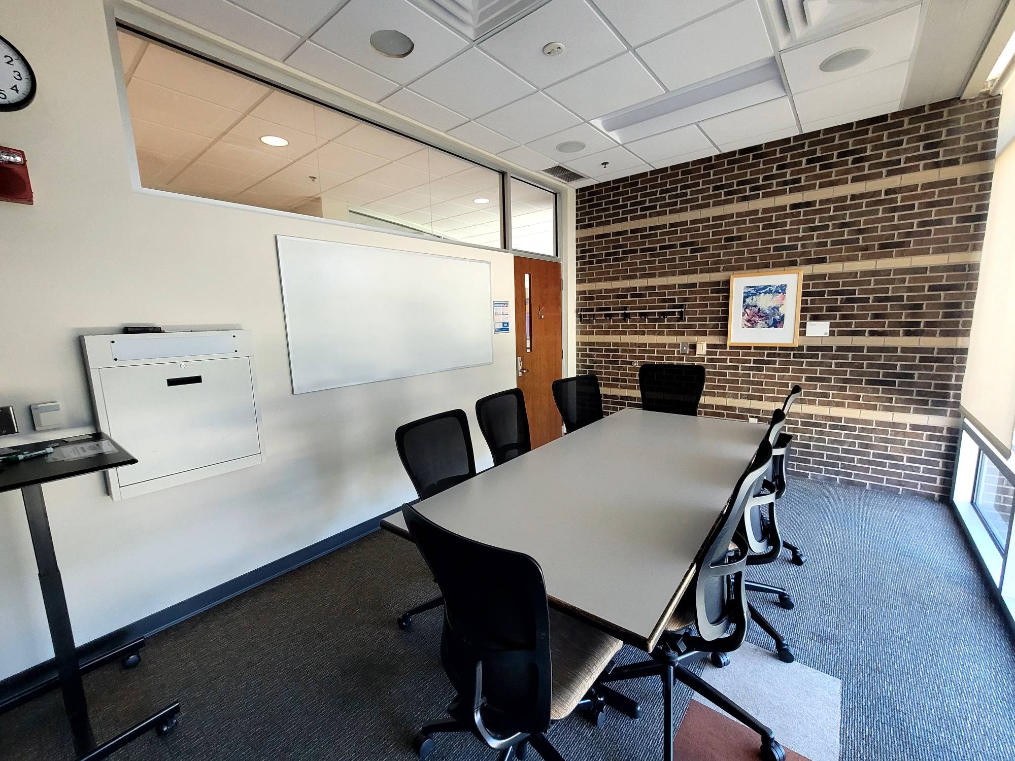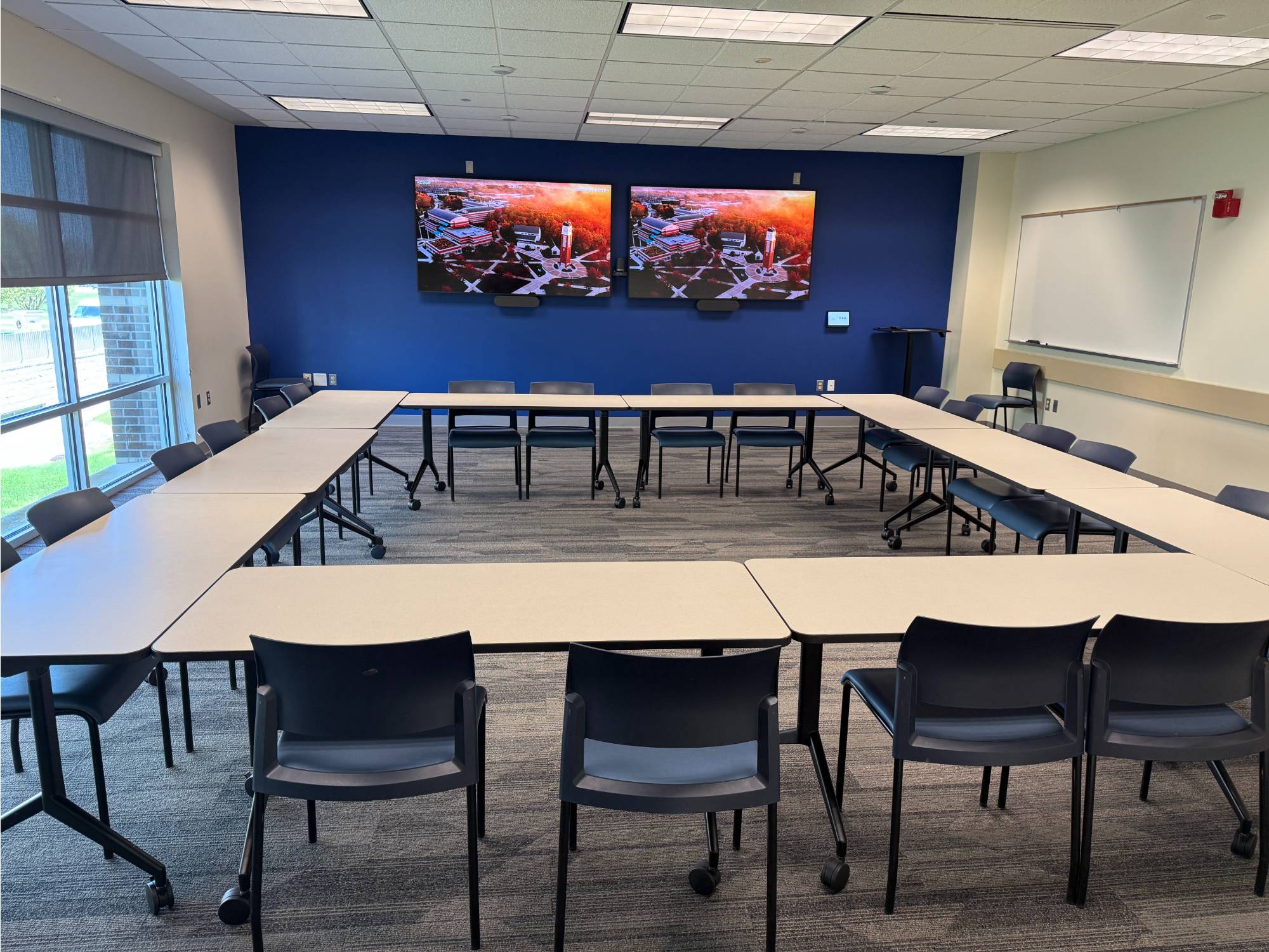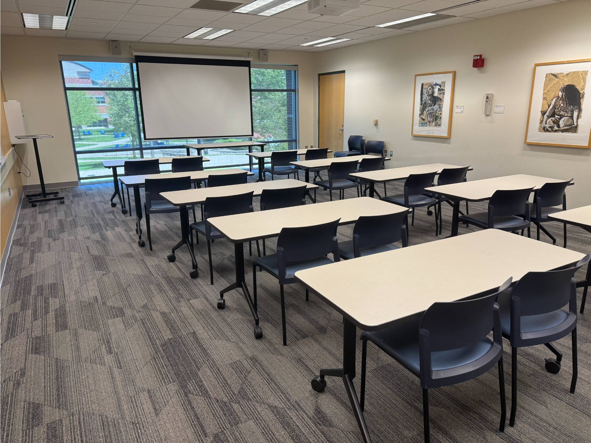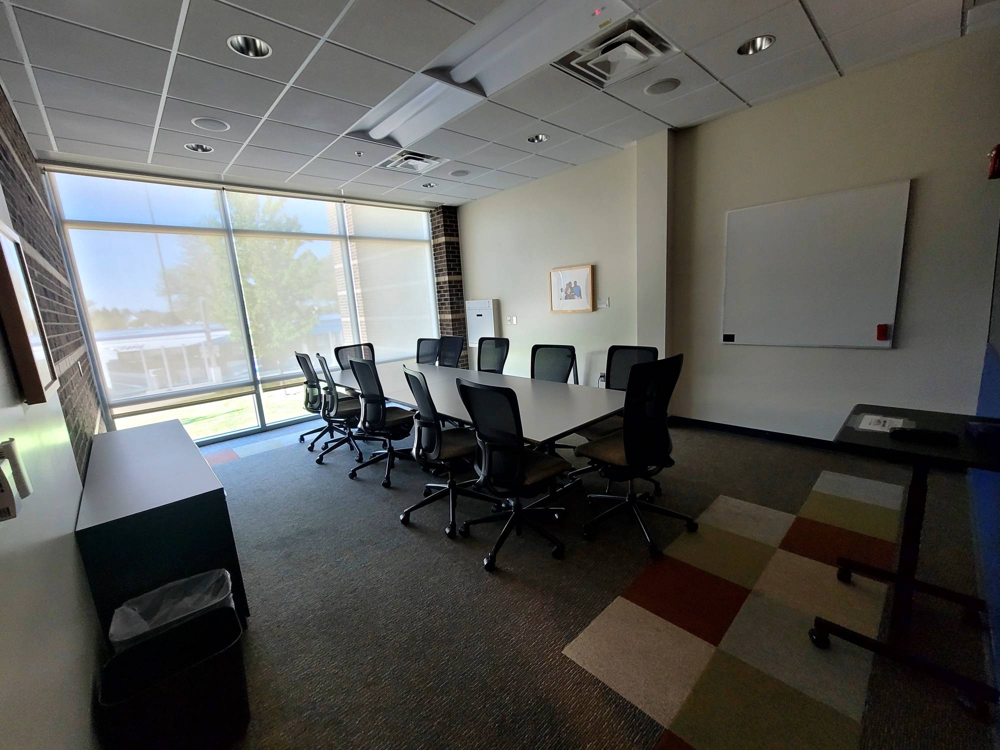 View 1 This is a smaller room that does not have installed A/V equipment, but televisions on carts, small portable sound systems, and mobile dry erase boards are available.