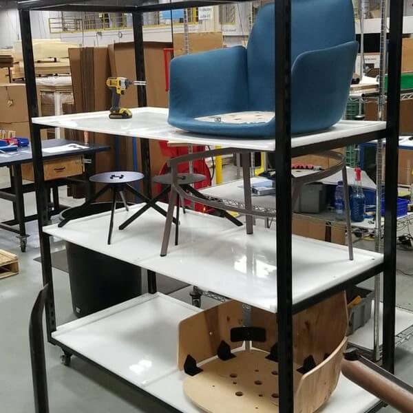 During this rotation I was tasked with designing a layout for a cell where a new product would be assembled. This included creating many drawings and ideas for how the cell would be arranged, as well as creating carts and racks to hold different tools and parts that would be used to assemble the chair.