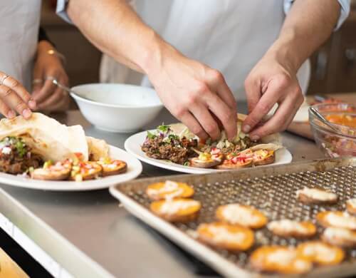 Before browning the turkey, Bernal showed Dittrich how to efficiently chop the onion and bell peppers that would flavor the meat along with Mexican spices and ancho chili paste. “Rolling your knife back and forth on the cutting board, rather than picking it up, helps keep your fingers safe,” he said. He also taught Dittrich how to smash a garlic bulb with the back of a knife and peel it quickly (a Bernal tip: adding a pinch of salt to garlic cloves makes them easier to peel).