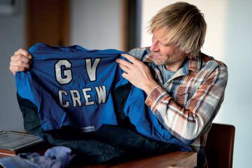 There’s the faded blue baseball cap with “GVSU Rowing” embroidered across the front two panels. The bill is torn. The sweatband is filthy, a ring of salt encrusted into it, all those hours of sweat and hard work poured into training. Moon pulls out the team’s windbreaker, silkscreened with “Grand Valley Rowing” on the left chest panel and “GV Crew” on the back.