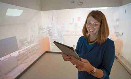 Katie Branch stands in the Collaborative Practice Lab, which features immersive technology on three walls. (Amanda Pitts)