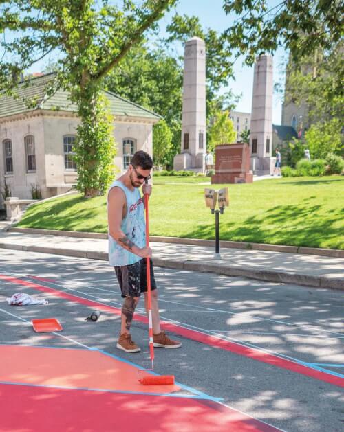 As he created a commissioned mural on a block-long swath of pavement in downtown Grand Rapids to commemorate Pride Month, Joey Salamon ’10 didn’t have to look far, even in his mind’s eye, for reminders of his strong connection to Grand Valley.