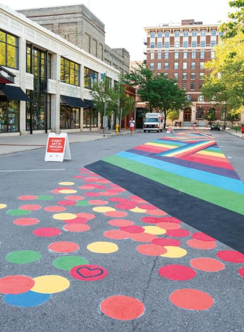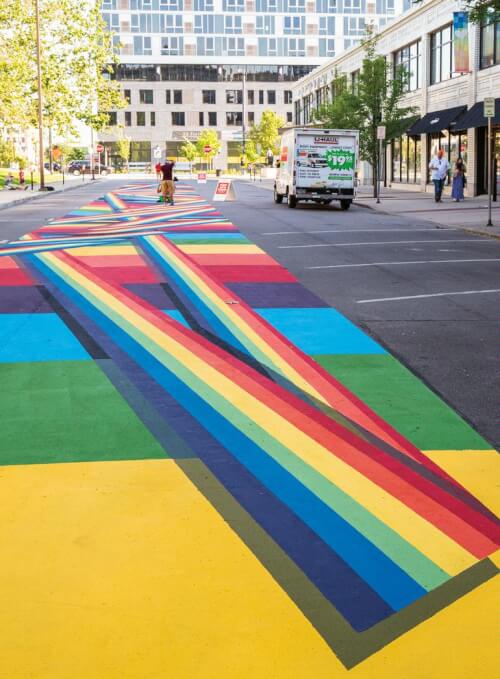 Salamon brushed road-marking paint one color at a time to complete the piece that incorporated the rainbow symbolism associated with Pride Month as well as his own geometric, abstract elements to represent everyone’s uniqueness.