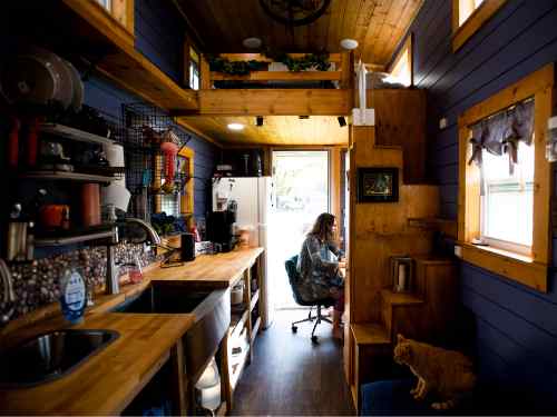 Pinterest and other research led Simon to develop a list of what worked well for other tiny home owners and what did not. Her kitchen has a full-size refrigerator and — because she enjoys baking — oven. A full-size washer and dryer sit near the shower and composting toilet. Stairs lead to a loft bed and a catwalk ledge runs nearly the length of the house, to the delight of Simon's two cats.